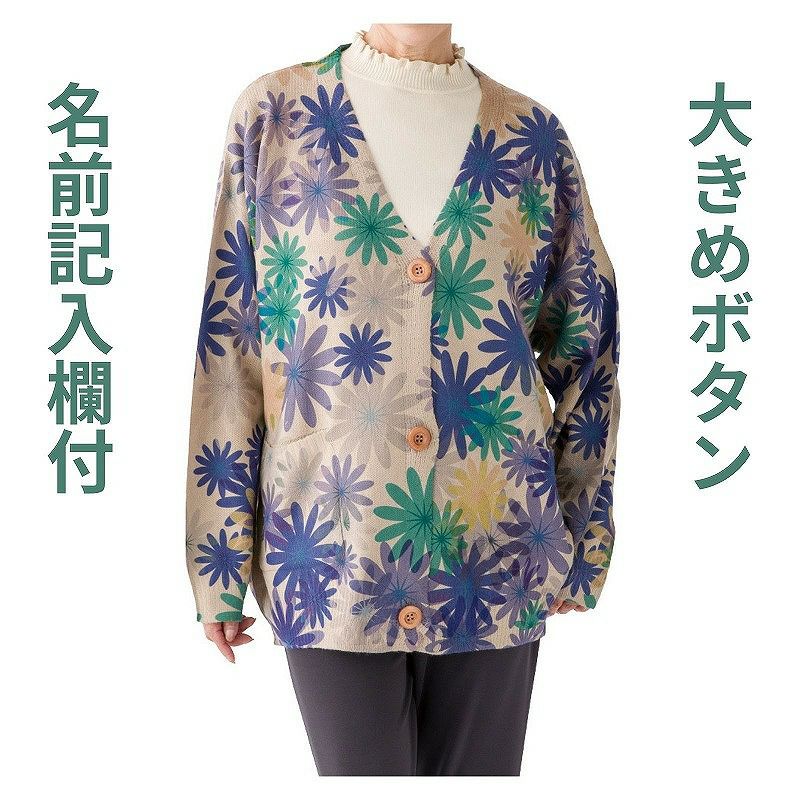 快適な日常生活をお過ごしいただけるためにお役立ていただける商品です着やすさとやさしい工夫のアイテムですゆったりサイズなので中に着るものを選ばず便利です!気軽に羽織れて上手に体型をカバーできるので安心着脱カンタン!様々な工夫力が入りやすくつかみやすい大きめボタンで留め外しがスムースで脱ぎ着しやすい工夫を凝らした優しい設計です。ゆったりした身幅で、脱ぎ着もしやすく、快適な着心地です。名前記入欄付で間違い防止名前が書けるタグ付きなので、入院や施設入居時など、脱いだ後や洗濯後も他人のものと間違うことがありません。●品名/花柄プリントゆったりカーディガン●色/ベージュ●サイズ/M~L●素材/ポリエステル65%・ナイロン35%●生産国/中国製●仕様/手洗い 名前記入欄付 大きめボタン 前ポケット付 身幅ゆったり●説明/ゆったりサイズなので中に着るものを選ばず便利です!気軽に羽織れて上手に体型をカバーできるので安心