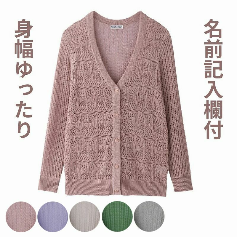 快適な日常生活をお過ごしいただけるためにお役立ていただける商品です着やすさとやさしい工夫のアイテムです【快適ニット】着やすさとやさしい工夫がうれしい!冷房や日除け対策にも欠かせない快適ニットインナーとも合わせやすく、脱ぎ着しやすく羽織るのに便利!熱気が逃げやすい前後透かし柄。留め外しの楽な斜め釦ホール仕様です。ゆったりした身幅で、脱ぎ着もしやすく、快適な着心地です。名前記入欄付で間違い防止名前が書けるタグ付きなので、入院や施設入居時など、脱いだ後や洗濯後も他人のものと間違うことがありません。●品名/婦人透かし柄V首カーディガン●色/ベージュ・グレー・ラベンダー・ローズ・グリーン●サイズ/M~L・LL●素材/レーヨン90%・ナイロン10%●生産国/中国製●仕様/洗濯機OK 名前記入欄付 斜めボタンホール 身幅ゆったり●説明/【快適ニット】着やすさとやさしい工夫がうれしい!冷房や日除け対策にも欠かせない快適ニットインナーとも合わせやすく、脱ぎ着しやすく羽織るのに便利!熱気が逃げやすい前後透かし柄。留め外しの楽な斜め釦ホール仕様です。