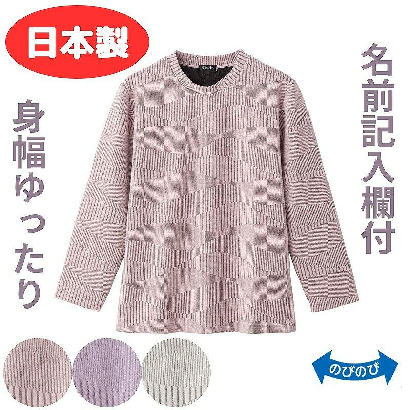 快適な日常生活をお過ごしいただけるためにお役立ていただける商品です着やすさとやさしい工夫のアイテムです若々しい印象のカジュアルTシャツは一年中楽しめますベーシックながらランダム柄がさりげなくおしゃれなTシャツ。着回し力抜群な定番カラーです。ゆったりした身幅で、脱ぎ着もしやすく、快適な着心地です。名前記入欄付で間違い防止名前が書けるタグ付きなので、入院や施設入居時など、脱いだ後や洗濯後も他人のものと間違うことがありません。●品名/ランダムストライプジャカードTシャツ●色/ベージュ・ピンク・パープル●サイズ/M~L・LL●素材/ポリエステル85%・レーヨン10%・ポリウレタン5%●生産国/日本製●仕様/洗濯機OK 名前記入欄付 身幅ゆったり のびのび●説明/若々しい印象のカジュアルTシャツは一年中楽しめますベーシックながらランダム柄がさりげなくおしゃれなTシャツ。着回し力抜群な定番カラーです。