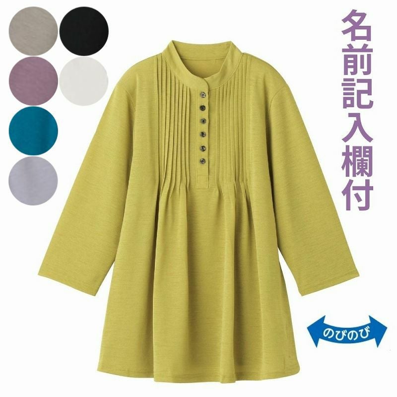 快適な日常生活をお過ごしいただけるためにお役立ていただける商品です着やすさとやさしい工夫のアイテムですウエスト回りが隠れる長めの丈がうれしいチュニックスタイル!体型をカバーするロングトップスで軽快に!すっきりした衿元で、着脱しやすい半開タイプ。名前記入欄付で間違い防止名前が書けるタグ付きなので、入院や施設入居時など、脱いだ後や洗濯後も他人のものと間違うことがありません。●品名/婦人7分袖ピンタック半開チュニック●色/オフ・カラシ・エメグリーン・モカベージュ・ラベンダー・グレー・ブラック●サイズ/M~L・LL●素材/ポリエステル95%・ポリウレタン5%●生産国/韓国製●仕様/洗濯機OK 名前記入欄付 のびのび 7分袖●説明/ウエスト回りが隠れる長めの丈がうれしいチュニックスタイル!体型をカバーするロングトップスで軽快に!すっきりした衿元で、着脱しやすい半開タイプ。