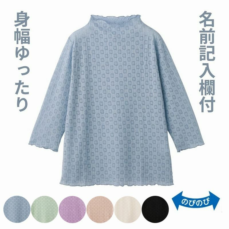 快適な日常生活をお過ごしいただけるためにお役立ていただける商品です着やすさとやさしい工夫のアイテムです【デイリーカジュアルスタイル】軽快な大人の遊び心を弾ませてデイリーの着こなしを!着心地の良いきれな色目のさわやかインナーですレーシー調でエレガントに。ゆったりした身幅で、脱ぎ着もしやすく、快適な着心地です。名前記入欄付で間違い防止名前が書けるタグ付きなので、入院や施設入居時など、脱いだ後や洗濯後も他人のものと間違うことがありません。●品名/婦人7分袖レーシージャカードTシャツ●色/オフ・オレンジ・グリーン・サックス・ラベンダー・ブラック●サイズ/M~L・LL●素材/ポリエステル95%・ポリウレタン5%●生産国/韓国製●仕様/洗濯機OK 名前記入欄付 身幅ゆったり のびのび 7分袖●説明/【デイリーカジュアルスタイル】軽快な大人の遊び心を弾ませてデイリーの着こなしを!着心地の良いきれな色目のさわやかインナーですレーシー調でエレガントに。