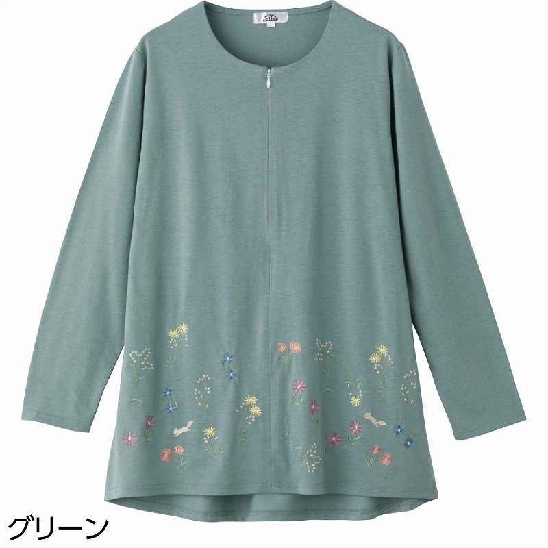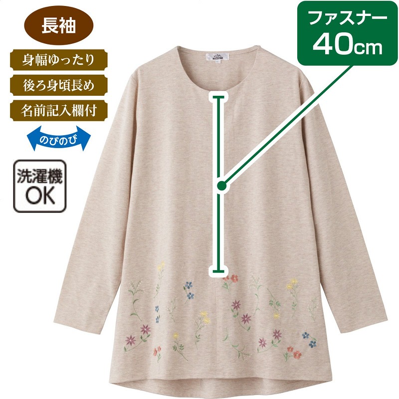 快適な日常生活をお過ごしいただけるためにお役立ていただける商品です着やすさとやさしい工夫のアイテムです長めの丈感で気になるお腹まわりをやさしくカバーしてくれるチュニックTシャツ。裾にあしらった可愛らしい刺繍がさりげないアクセントになり、シンプルながら華やかな印象に仕上げました。ロングファスナー仕様で大きく開き、着脱もスムーズ。身幅はゆったり、後ろ身頃も長めにして安心感のある着心地です。名前記入欄付きで管理にも便利な一枚です。着脱カンタン!様々な工夫ファスナー合わせが不要。下からでも着脱できます。上からでも下からでも脱ぎ着できるロングファスナーで着替えがラクラクです。後ろ身頃を長めにしているので、背中が曲がった方でも、背中が出にくい設計です。ゆったりした身幅で、脱ぎ着もしやすく、快適な着心地です。名前記入欄付で間違い防止名前が書けるタグ付きなので、入院や施設入居時など、脱いだ後や洗濯後も他人のものと間違うことがありません。●品名/ロングファスナーチュニックTシャツ●色/ベージュ・ローズ・グリーン●サイズ/M~L●素材/ポリエステル65%・綿35%●生産国/中国製●仕様/洗濯機OK(ネット使用) 名前記入欄付 ロングファスナー 後ろ身頃長め 身幅ゆったり のびのび のびのび 長袖 長め丈でお腹まわりをカバー。裾の刺繍が可愛らしい!