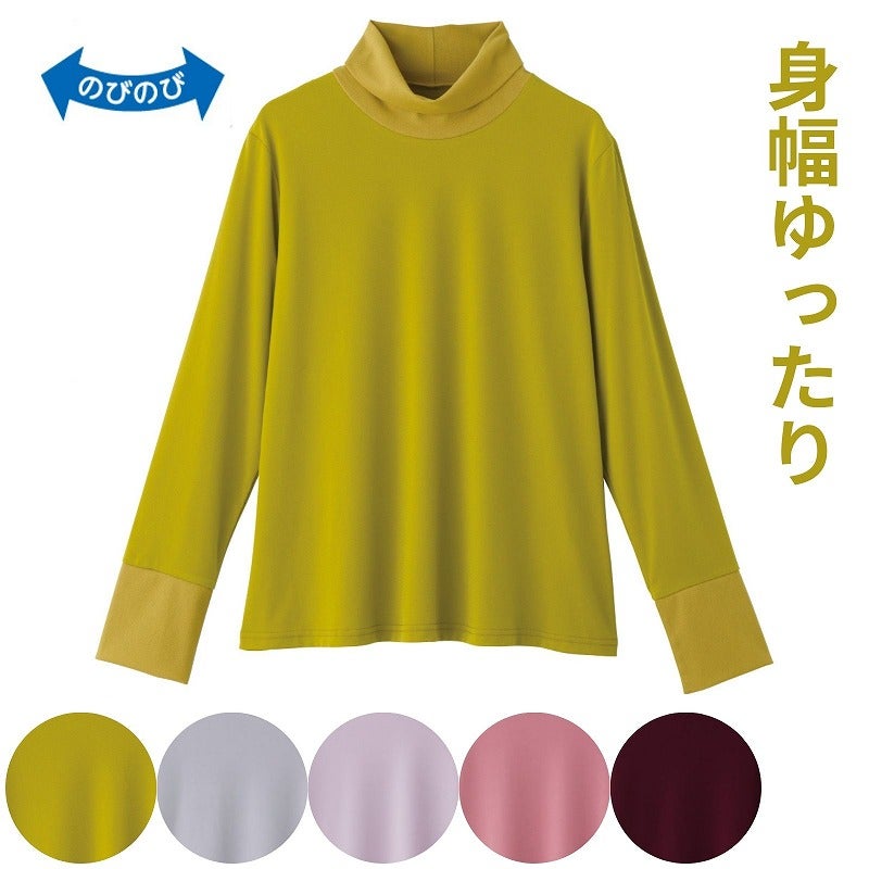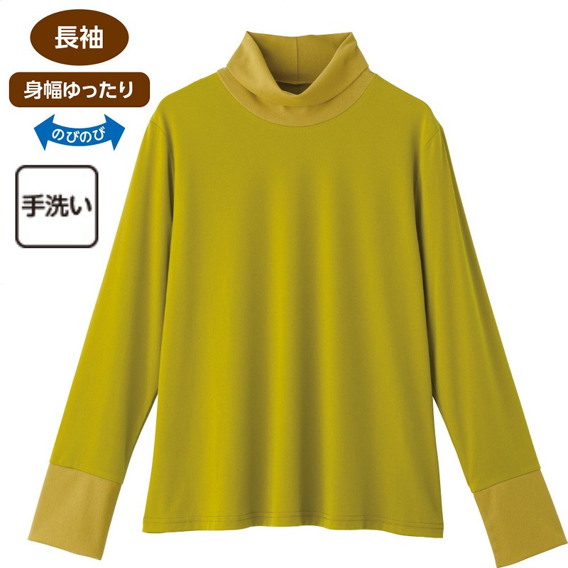 ゆったりとしたハイネックで首元をやさしく包み込み、締めつけ感なく安心して着られる一枚です♪身幅ゆったりのラクな着心地に加え、ストレッチ素材で動きやすさも◎。長袖で冷えが気になる季節にも重宝し、毎日の装いに取り入れやすい快適な着心地です。