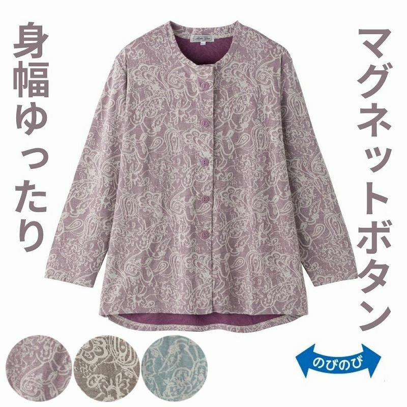 快適な日常生活をお過ごしいただけるためにお役立ていただける商品です着やすさとやさしい工夫のアイテムです【あなたにやさしいお洋服】機能性とお洒落を追求しました着やすさとやさしい工夫がうれしい!自分で着れる人も着せる人も笑顔になれる前向きなお洋服です片手でも留めやすいマグネットボタン式ジャカード編みで上品さと高級感を演出。着脱カンタン!様々な工夫2種類のボタンがあるので指先のトレーニングとして最適ですカジュアルな装いで、片手でも簡単に留めはずしができる便利なマグネットボタン(第一・第二)と大きめボタン(第三ボタン以降)仕様。ゆったりした身幅で、脱ぎ着もしやすく、快適な着心地です。名前記入欄付で間違い防止名前が書けるタグ付きなので、入院や施設入居時など、脱いだ後や洗濯後も他人のものと間違うことがありません。後ろ身頃を長めにしているので、背中が曲がった方でも、背中が出にくい設計です。●品名/婦人カットマグネット釦カーディガン(指先ストレッチ)●色/グリーン・ローズパープル・モカ●サイズ/M~L●素材/ポリエステル50%・レーヨン45%・ポリウレタン5%●生産国/中国製●仕様/洗濯機OK 名前記入欄付 マグネットボタン(ひっぱるタイプ) ポケット付 後ろ身頃長め 身幅ゆったり のびのび 長袖 ※ペースメーカーをお使いの方は使用を控えてください。(誤作動を招く恐れがあります。)●説明/【あなたにやさしいお洋服】機能性とお洒落を追求しました着やすさとやさしい工夫がうれしい!自分で着れる人も着せる人も笑顔になれる前向きなお洋服です片手でも留めやすいマグネットボタン式ジャカード編みで上品さと高級感を演出。
