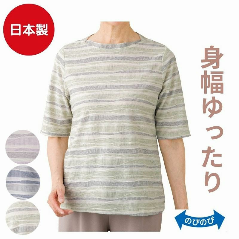 快適な日常生活をお過ごしいただけるためにお役立ていただける商品です着やすさとやさしい工夫のアイテムです【デイリーカジュアルスタイル】軽快な大人の遊び心を弾ませてデイリーの着こなしを!着心地の良いきれな色目のさわやかインナーです上質で落ち着いたボーダー柄でやわらかなコットン素材。ゆったりした身幅で、脱ぎ着もしやすく、快適な着心地です。●品名/婦人5分袖タックボーダージャカードTシャツ●色/ラベンダー・グリーン・ネイビー●サイズ/M・L・LL●素材/綿55%・ポリエステル45%●生産国/日本製●仕様/洗濯機OK 身幅ゆったり のびのび 5分袖●説明/【デイリーカジュアルスタイル】軽快な大人の遊び心を弾ませてデイリーの着こなしを!着心地の良いきれな色目のさわやかインナーです上質でやわらかなコットン素材。