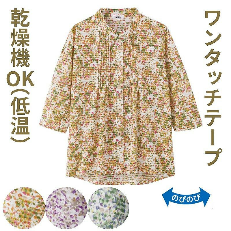 マジックテープ商品に関するご注意洗濯時にはゴミのなどの付着の原因になりますのでテープを張り合わせてください。ゆったりした身幅で、脱ぎ着もしやすく、快適な着心地です。名前記入欄付で間違い防止名前が書けるタグ付きなので、入院や施設入居時など、脱いだ後や洗濯後も他人のものと間違うことがありません。後ろ身頃を長めにしているので、背中が曲がった方でも、背中が出にくい設計です。●品名/7分袖ワンタッチテープピンタックブラウス●色/オレンジ・グリーン・パープル●サイズ/M~L・S・LL・3L●素材/ポリエステル80%・綿20%●生産国/中国製●仕様/洗濯機OK(ネット使用) 名前記入欄付 ワンタッチテープ 後ろ身頃長め 身幅ゆったり のびのび 乾燥機OK(60℃まで) S・3Lサイズあり 7分袖 ●説明/ちょっぴり特別感のあるデイリーウエアさりげなく華やぐピンタックブラウスですオシャレなピンタックブラウスも全開でらくちん着脱!さらりとしつつ、軽くて柔らかい素材感。点描風のデザインがおしゃれです。乾燥機が使えるからお手入れ簡単!【乾燥機対応アウター】乾燥機は低温でご使用ください。
