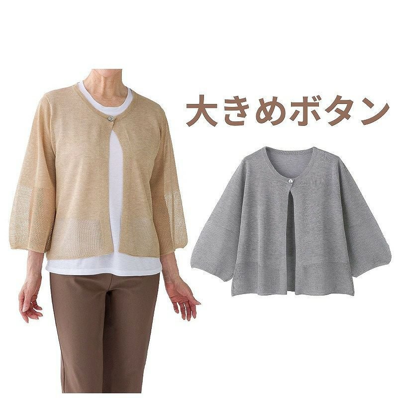 快適な日常生活をお過ごしいただけるためにお役立ていただける商品です着やすさとやさしい工夫のアイテムです着やすさと着心地ゆったり感がうれしいお洒落なデザインニットトッパーで心弾む楽しいひととき!袖先と裾の透かし感が、ふんわりとした着心地を演出。●品名/ニットワンボタントッパーカーディ●色/ベージュ・グレー●サイズ/M・L●素材/レーヨン78%・ポリエステル22%●生産国/中国製●仕様/手洗い 大きめボタン 7分袖 ●説明/着やすさと着心地ゆったり感がうれしいお洒落なデザインニットトッパーで心弾む楽しいひととき!袖先と裾の透かし感が、ふんわりとした着心地を演出。