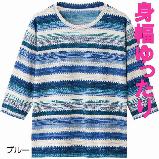 快適な日常生活をお過ごしいただけるためにお役立ていただける商品です【デイリーカジュアルスタイル】お出かけを素敵に演出!軽快な大人の遊び心を弾ませてデイリーの着こなしをレベルアップお出かけにも普段着にも着られるから多方面で大活躍のアイテム涼感クール素材でサラッと着られるかすり調です●品名/7分袖ボーダー柄Tシャツ●色/パープル・ブルー●サイズ/M~L・LL●材質/綿95%・ポリウレタン5%●生産国/韓国製●仕様・説明/涼感クール 洗濯機OK のびのび 身幅ゆったり ●説明/涼感クール素材でサラッと着られるかすり調。