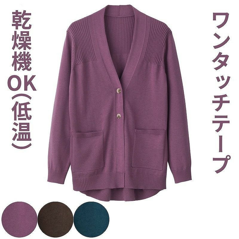 マジックテープ商品に関するご注意洗濯時にはゴミのなどの付着の原因になりますのでテープを張り合わせてください。後ろ身頃を長めにしているので、背中が曲がった方でも、背中が出にくい設計です。ゆったりした身幅で、脱ぎ着もしやすく、快適な着心地です。名前記入欄付で間違い防止名前が書けるタグ付きなので、入院や施設入居時など、脱いだ後や洗濯後も他人のものと間違うことがありません。●品名/なめらか毛混ワンタッチテープニットカーディガン●色/モカ・ローズ・グリーン●サイズ/M~L・LL●素材/ポリエステル50%・ナイロン25%・アクリル20%・毛5%●生産国/中国製●仕様/洗濯機OK(ネット使用) 名前記入欄付 ワンタッチテープ 前ポケット付 後ろ身頃長め 身幅ゆったり 乾燥機OK(60℃まで)●説明/【あったかニットコレクション】お出かけにもおうちでのリラックス時にも着られるから多方面で大活躍のアイテムゆったりとしたシルエット。軽い着心地と、なめらかでもっちりな肌触り。さらっと羽織れるシルエット!乾燥機が使えるからお手入れ簡単!【乾燥機対応アウター】お手入れラクラクでうれしい!お洗濯の手間が減ります。乾燥機は低温でご使用ください。