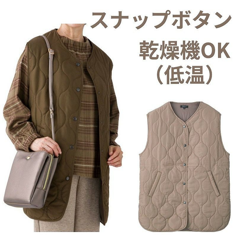 快適な日常生活をお過ごしいただけるためにお役立ていただける商品です着やすさとやさしい工夫のアイテムですサッと羽織るだけでおしゃれ感を演出できます。軽くて暖か1枚羽織るだけでサマになる、袖なしで動きやすく温度調整がしやすいベストです。乾燥機が使えるからお手入れ簡単!【乾燥機対応アウター】お手入れラクラクでうれしい!お洗濯の手間が減ります。乾燥機は低温でご使用ください。●品名/イージーケアキルトベスト●色/モカ・カーキ●サイズ/M・L●素材/ポリエステル100%●生産国/バングラディシュ製●仕様/洗濯機OK(ネット使用) スナップボタンで便利! 両脇ポケット付 乾燥機OK(60℃まで)●説明/サッと羽織るだけでおしゃれ感を演出できます。軽くて暖か1枚羽織るだけでサマになる、袖なしで動きやすく温度調整がしやすいベストです。乾燥機が使えるからお手入れ簡単!【乾燥機対応アウター】お手入れラクラクでうれしい!お洗濯の手間が減ります。乾燥機は低温でご使用ください。