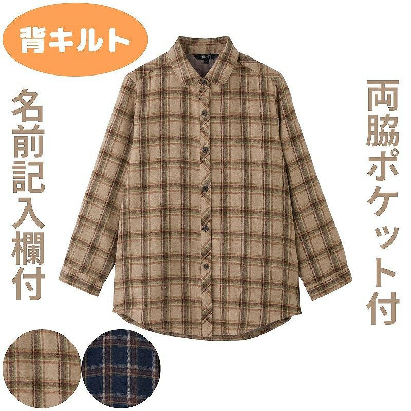 快適な日常生活をお過ごしいただけるためにお役立ていただける商品です着やすさとやさしい工夫のアイテムです背中側があたたかなキルト!すっきり着られるのにあたたかい♪脱ぎ着もラクなシャツジャケットですゆったりした身幅で、脱ぎ着もしやすく、快適な着心地です。名前記入欄付で間違い防止名前が書けるタグ付きなので、入院や施設入居時など、脱いだ後や洗濯後も他人のものと間違うことがありません。●品名/背キルト格子柄シャツブラウス●色/ブラウン・ネイビー●サイズ/M・L●素材/ポリエステル60%・綿30%・レーヨン10%、裏:ポリエステル100%●生産国/中国製●仕様/手洗い 両脇ポケット付 背キルト 身幅ゆったり●説明/背中側があたたかなキルト!すっきり着られるのにあたたかい♪脱ぎ着もラクなシャツジャケットです