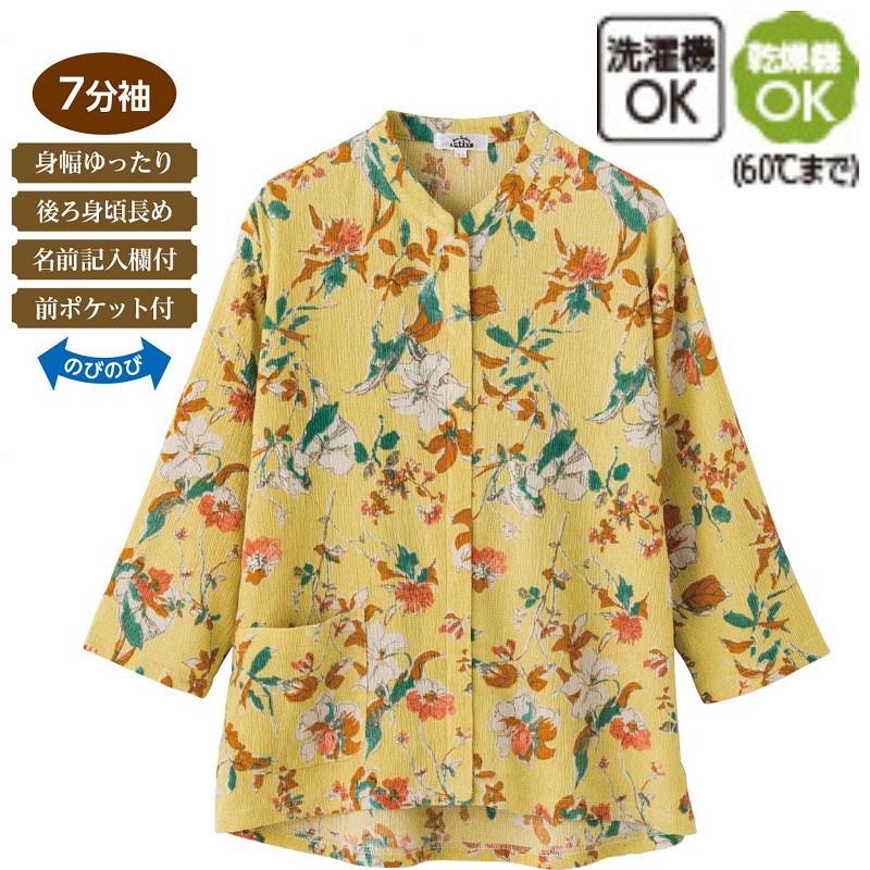涼やかな楊柳素材を使用し、さらりとした肌ざわりで汗ばむ季節も快適に過ごせる一枚です。見た目は普通のTシャツのようにすっきりしていますが、前はスナップボタン仕様で大きく開き、かぶらずに着脱できるのも嬉しいポイント。七分袖で腕まわりを動かしやすく、身幅はゆったり、後ろ身頃は長めの設計で体型もさりげなくカバーします。名前記入欄付きで管理もしやすく、前ポケットはちょっとした小物入れに便利。乾燥機(60℃まで)対応でお手入れも簡単です。