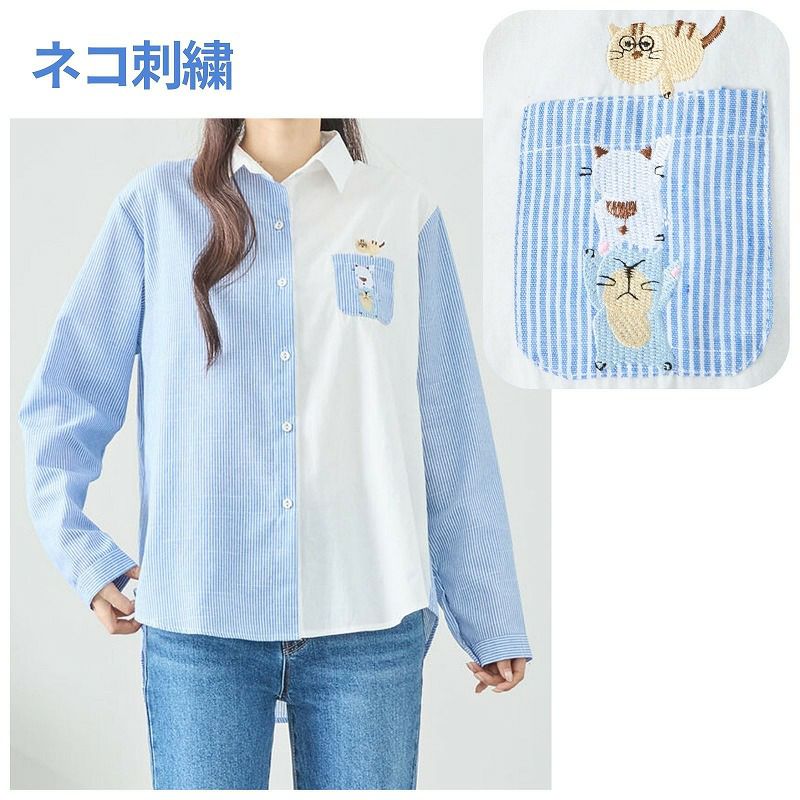 左右で柄が異なる、ストライプ×無地の切り替えデザインに、遊び心あふれる猫の刺繍が可愛らしさをプラスしてくれるシャツです。※ポケット口は開きません