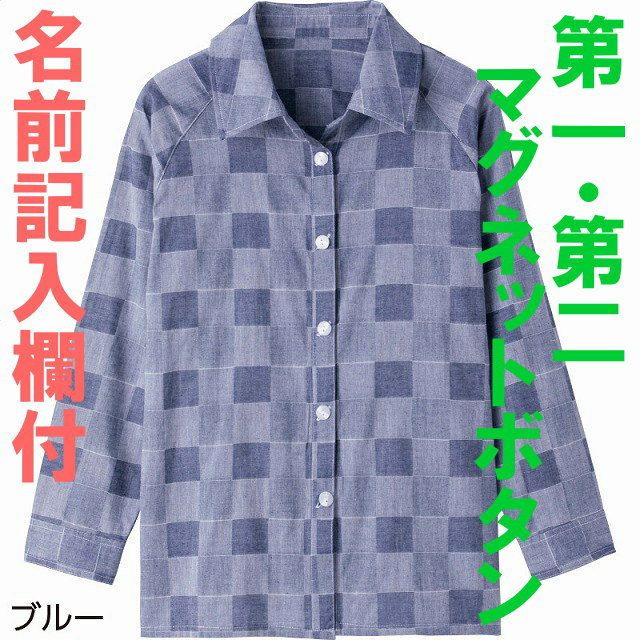 快適な日常生活をお過ごしいただけるためにお役立ていただける商品です2種類のボタンがあるので指先のトレーニングとして最適ですカジュアルな装いで、片手でも簡単に留めはずしができる便利なマグネットボタン(第一・第二)と大きめボタン(第三ボタン以降)仕様綿100%素材だから、肌触りも気持ちいい名前記入欄付で間違い防止名前が書けるタグ付きなので、入院や施設入居時など、脱いだ後や洗濯後も他人のものと間違うことがありません。●品名/格子柄マグネット釦ブラウス(指先ストレッチ)●色/ブルー・グレー●サイズ/M~L●材質/綿100%●生産国/中国製●仕様/洗濯機OK 名前記入欄付 ポケット付 動きやすいラグラン袖 身幅ゆったり ゆったりアームホール ●説明/綿100%素材だから、肌触りも気持ちいい。【指先ストレッチ】第1・第2ボタンがマグネットボタンです第3ボタンから下は大きめボタンで普通のボタンです袖口のボタンも普通のボタンです