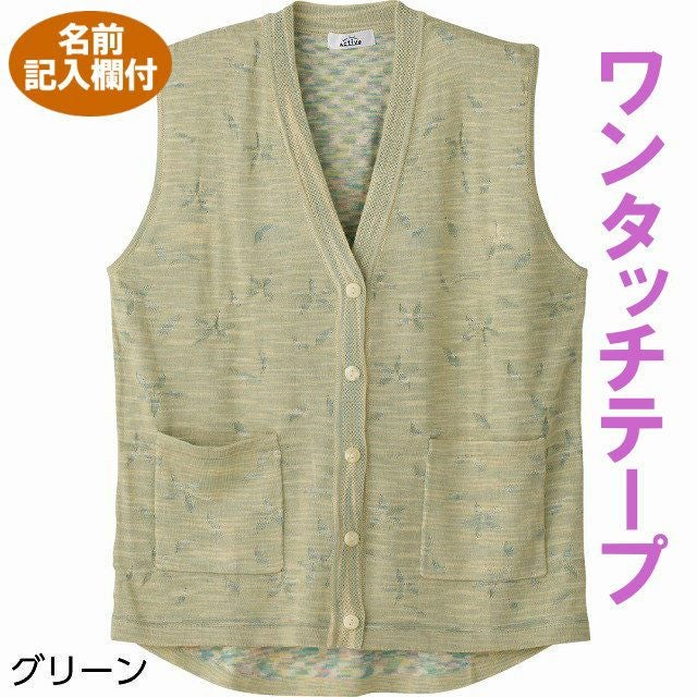 快適な日常生活をお過ごしいただけるためにお役立ていただける商品です【快適ニット】機能性とお洒落を追求しました着やすさとやさしい工夫がうれしい!冷房や日除け対策にも欠かせない快適ニットインナーとも合わせやすく、脱ぎ着しやすく羽織るのに便利!立体的で優雅な花柄。着脱カンタン!様々な工夫ワンタッチテープ仕様でボタンが留めにくい方も脱ぎ着しやすい工夫を凝らした優しい設計です。飾りボタンで見た目は普通の洋服と変わりませんマジックテープ商品に関するご注意洗濯時にはゴミのなどの付着の原因になりますのでテープを張り合わせてください。脱ぎ着もしやすく、快適な着心地です。後ろ身頃を長めにしているので、背中が曲がった方でも、背中が出にくい設計です。名前記入欄付で間違い防止名前が書けるタグ付きなので、入院や施設入居時など、脱いだ後や洗濯後も他人のものと間違うことがありません。●品名/婦人ニットワンタッチテープV首ベスト●色/グリーン・パープル・ローズ●サイズ/M~L・S・LL●素材/アクリル100% ジャカード●生産国/中国製●仕様/ワンタッチテープ 名前記入欄付 身幅ゆったり 前ポケット付 後ろ身頃長め 洗濯機OK(ネット使用)●説明/立体的で優雅な花柄。