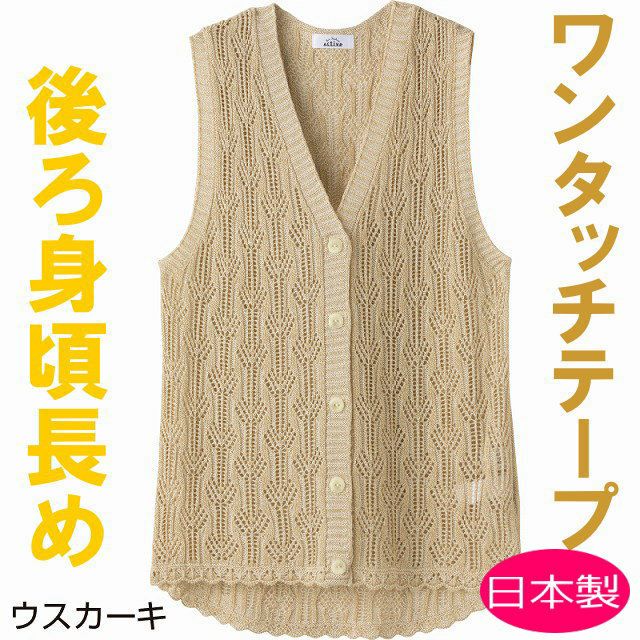 快適な日常生活をお過ごしいただけるためにお役立ていただける商品です【快適ニット】機能性とお洒落を追求しました着やすさとやさしい工夫がうれしい!冷房や日除け対策にも欠かせないニットVネックでインナーとも合わせやすいです。ワンタッチテープで留め外しがらくらく落ち着いたカラーで、着脱ラクラクベスト着脱カンタン!様々な工夫ワンタッチテープ仕様でボタンが留めにくい方も脱ぎ着しやすい工夫を凝らした優しい設計です。飾りボタンで見た目は普通の洋服と変わりません名前記入欄付で間違い防止名前が書けるタグ付きなので、入院や施設入居時など、脱いだ後や洗濯後も他人のものと間違うことがありません。●品名/国産ワンタッチ麻混V首ベスト●色/ベージュ・グレー・ウスカーキ●サイズ/M~L●材質/アクリル50%・レーヨン40%・麻10%●生産国/日本製●仕様/手洗い 名前記入欄付 ワンタッチテープ 後ろ身頃長め 身幅ゆったり ●説明/落ち着いたカラーで、着脱ラクラクベスト。