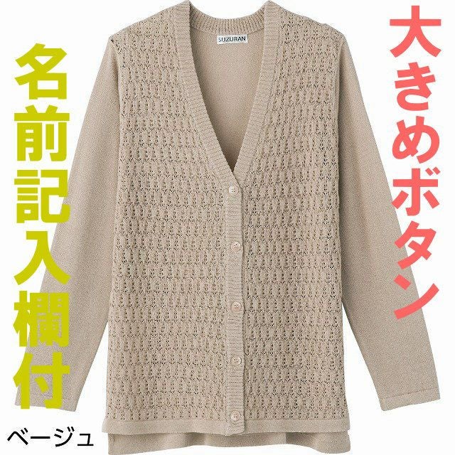 快適な日常生活をお過ごしいただけるためにお役立ていただける商品です【快適ニット】機能性とお洒落を追求しました着やすさとやさしい工夫がうれしい!冷房や日除け対策にも欠かせない快適ニットインナーとも合わせやすく、脱ぎ着しやすく羽織るのに便利!脱ぎ着がしやすい大きめボタン&斜めボタンホール。着脱カンタン!様々な工夫つかみやすい大きめボタンと斜めボタンホールで脱ぎ着しやすい工夫を凝らした優しい設計です。脱ぎ着もしやすく、快適な着心地です。後ろ身頃を長めにしているので、背中が曲がった方でも、背中が出にくい設計です。名前記入欄付で間違い防止名前が書けるタグ付きなので、入院や施設入居時など、脱いだ後や洗濯後も他人のものと間違うことがありません。●品名/婦人ニット後ろ長めV首カーディ●色/ベージュ・ラベンダー・ローズ・グリーン●サイズ/M~L●素材/レーヨン90%・ナイロン10%●生産国/中国製●仕様/大きめボタン&斜めボタンホール 名前記入欄付 身幅ゆったり 後ろ身頃長め 洗濯機OK(ネット使用)●説明/脱ぎ着がしやすい大きめボタン&斜めボタンホール。