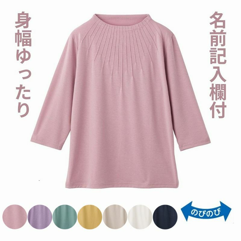 快適な日常生活をお過ごしいただけるためにお役立ていただける商品です着やすさとやさしい工夫のアイテムです【デイリーカジュアルスタイル】軽快な大人の遊び心を弾ませてデイリーの着こなしを!着心地の良いきれな色目のさわやかインナーです首元スッキリボトルネック。ゆったりした身幅で、脱ぎ着もしやすく、快適な着心地です。名前記入欄付で間違い防止名前が書けるタグ付きなので、入院や施設入居時など、脱いだ後や洗濯後も他人のものと間違うことがありません。●品名/婦人7分袖衿元ピンタックTシャツ●色/オフ・ベージュ・ピンク・カラシ・グリーン・ラベンダー・ネイビー●サイズ/M~L・LL●素材/ポリエステル60%・レーヨン35%・ポリウレタン5%●生産国/韓国製●仕様/洗濯機OK 名前記入欄付 身幅ゆったり のびのび 7分袖●説明/【デイリーカジュアルスタイル】軽快な大人の遊び心を弾ませてデイリーの着こなしを!着心地の良いきれな色目のさわやかインナーです首元スッキリボトルネック。