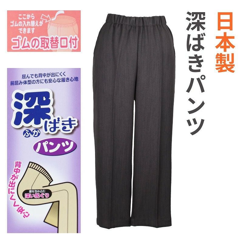 快適な日常生活をお過ごしいただけるためにお役立ていただける商品です着やすさとやさしい工夫のアイテムです前かがみになっても背中が出にくいシルエット●品名/背中が出にくい深ばきパンツ●色/モカ・グレー・ブラック●サイズ/M・L・LL●素材/ポリエステル100%●生産国/日本製●仕様/両脇ポケット付き 裏地なしゴム取り換え口付き●説明/前かがみになっても背中が出にくいシルエット