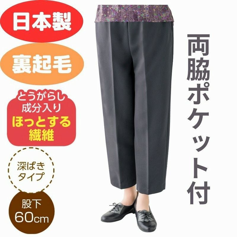 快適な日常生活をお過ごしいただけるためにお役立ていただける商品です着やすさとやさしい工夫のアイテムです【深履きパンツ】股上深めの設計でしゃがんでも背中が出にくい!股上が深めに設計されていてゆったりと腰回りをおおうのでしゃがんでも背中や下着が見えてしまう心配がありません。腰の曲がりが気になる方にもおすすめ。とうがらし成分入りで保温効果があります。名前記入欄付で間違い防止名前が書けるタグ付きなので、入院や施設入居時など、脱いだ後や洗濯後も他人のものと間違うことがありません。【深履きパンツ】股上深めの設計でしゃがんでも背中が出にくい!股上が深めに設計されていてゆったりと腰回りをおおうのでしゃがんでも背中や下着が見えてしまう心配がありません。腰の曲がりが気になる方にもおすすめ。●品名/婦人裏起毛トウガラシ加工深履きらくらくパンツ●色/モカ・グレー・ブラック●サイズ/S・M・L・LL・3L●素材/ポリエステル100%●生産国/日本製●仕様/洗濯機OK(ネット使用) 名前記入欄付 両脇ポケット付 ゴム取替可能 股下60cm 裏起毛 Sサイズあり、深ばきタイプ とうがらし成分入り●説明/とうがらし成分入りで保温効果があります。
