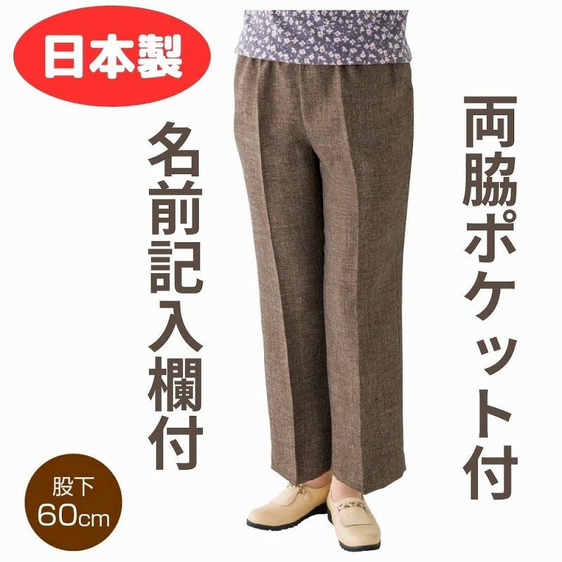 快適な日常生活をお過ごしいただけるためにお役立ていただける商品です着やすさとやさしい工夫のアイテムです一年を通してはけるストレートパンツ普段ばきにぴったりのラクなはき心地。へリンボン織りの高見え生地。名前記入欄付で間違い防止名前が書けるタグ付きなので、入院や施設入居時など、脱いだ後や洗濯後も他人のものと間違うことがありません。●品名/婦人ヘリンボンストレートパンツ●色/ベージュ・ブラウン・グレー●サイズ/M・L・LL・3L●素材/ポリエステル100%●生産国/日本製●仕様/※ウエストゴム取替え仕様ではありません。 洗濯機OK(ネット使用) 名前記入欄付 両脇ポケット付 股下60cm●説明/一年を通してはけるストレートパンツ普段ばきにぴったりのラクなはき心地。