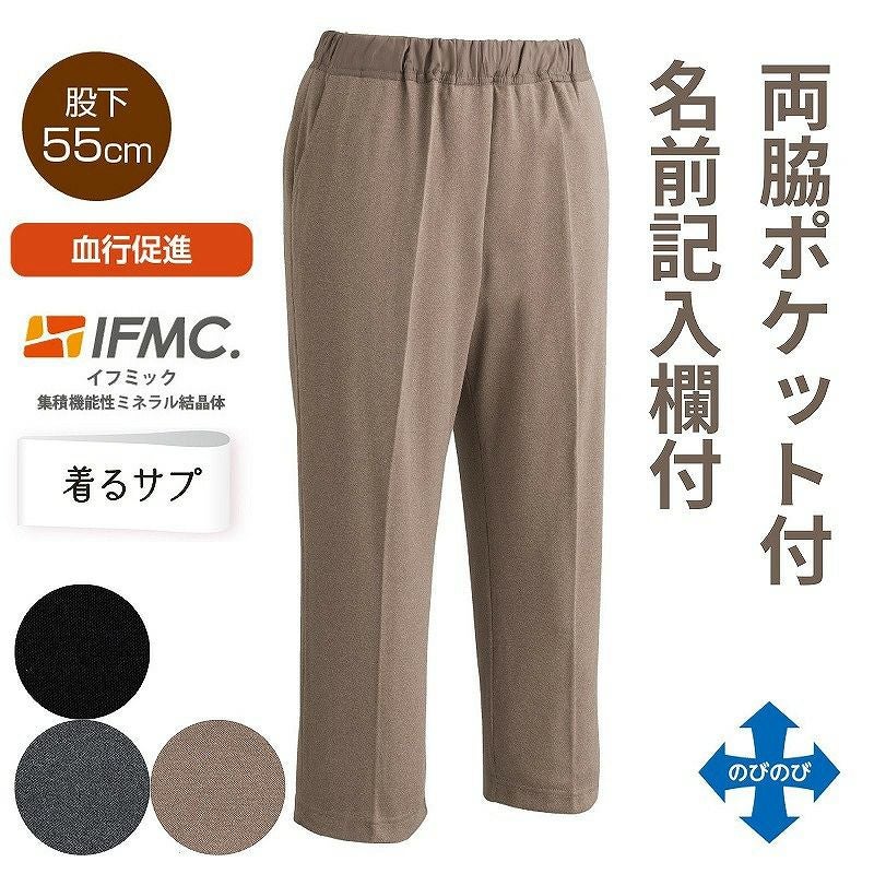 快適な日常生活をお過ごしいただけるためにお役立ていただける商品です着やすさとやさしい工夫のアイテムです温泉の研究から作った、血行促進効果ができる「着るサプ」。温泉の効果に着眼して開発した血行促進素材を繊維に加工させて作りました。着用し続けることで効果を実感してみてください。お部屋・ご近所など普段使いに! ゴム取替え可能●品名/着るサプIFMC.おしりスルッとカチオンライトパンツ●色/ベージュ・グレー・ブラック●サイズ/S・M・L・LL・3L●素材/ポリエステル100%●生産国/中国製●仕様/着るサプ 名前記入欄付 股下55cm 両脇ポケット付き のびのび(縦横) ゴムの取り換え可能●説明/お部屋・ご近所など普段使いに! ゴム取替え可能IFMC.(イフミック:集積機能性ミネラル結晶体)は(株)テイコク製薬社が温泉療法に着眼して製造したナノメーターレベルの非常に微小なミネラルの結晶体です。 数種類の鉱物を組み合わせて鉄分の多い温泉水に一定時間浸漬し、その溶出液を特殊処理して抽出した物質です。身体に近接させることで血管から一酸化窒素(NO)が拡散し、血管が拡張することによる血行促進効果が期待できます。