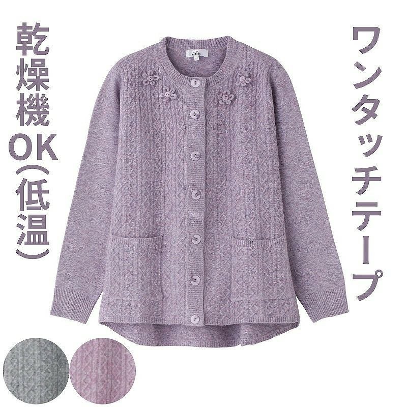 快適な日常生活をお過ごしいただけるためにお役立ていただける商品です着やすさとやさしい工夫のアイテムですやさしい機能がいっぱい!【あなたにやさしいお洋服】乾燥機が使えるからお手入れ簡単!【乾燥機対応アウター】お手入れラクラクでうれしい!お洗濯の手間が減ります。乾燥機は低温でご使用ください。毛混でしっかりあたたかい!着脱カンタン!様々な工夫ワンタッチテープ仕様でボタンが留めにくい方も脱ぎ着しやすい工夫を凝らした優しい設計です。手や指の負担も軽減します。着替えや検温時にはさっと開閉できます。飾りボタンで見た目は普通の洋服と変わりませんマジックテープ商品に関するご注意洗濯時にはゴミのなどの付着の原因になりますのでテープを張り合わせてください。ゆったりした身幅で、脱ぎ着もしやすく、快適な着心地です。後ろ身頃を長めにしているので、背中が曲がった方でも、背中が出にくい設計です。名前記入欄付で間違い防止名前が書けるタグ付きなので、入院や施設入居時など、脱いだ後や洗濯後も他人のものと間違うことがありません。●品名/婦人あったか毛混ワンタッチテープニットカーディガン●色/グレー・ピンク・パープル●サイズ/M-L・S・LL・3L●素材/ポリエステル75%・アクリル10%・ナイロン10%・毛3%・ポリウレタン2%●生産国/中国製●仕様/洗濯機OK 名前記入欄付 ワンタッチテープ 前ポケット付 後ろ身頃長め 身幅ゆったり 乾燥機OK(低温)●説明/やさしい機能がいっぱい!【あなたにやさしいお洋服】乾燥機が使えるからお手入れ簡単!【乾燥機対応アウター】お手入れラクラクでうれしい!お洗濯の手間が減ります。乾燥機は低温でご使用ください。毛混でしっかりあたたかい!