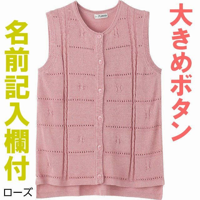 快適な日常生活をお過ごしいただけるためにお役立ていただける商品です【快適ニット】機能性とお洒落を追求しました着やすさとやさしい工夫がうれしい!冷房や日除け対策にも欠かせない快適ニットインナーとも合わせやすく、脱ぎ着しやすく羽織るのに便利!脱ぎ着がしやすい大きめボタン&斜めボタンホール。着脱カンタン!様々な工夫つかみやすい大きめボタンと斜めボタンホールで脱ぎ着しやすい工夫を凝らした優しい設計です。脱ぎ着もしやすく、快適な着心地です。後ろ身頃を長めにしているので、背中が曲がった方でも、背中が出にくい設計です。名前記入欄付で間違い防止名前が書けるタグ付きなので、入院や施設入居時など、脱いだ後や洗濯後も他人のものと間違うことがありません。●品名/婦人ニット後ろ長め丸首ベスト●色/ベージュ・ラベンダー・ローズ・グリーン●サイズ/M~L●素材/レーヨン90%・ナイロン10%●生産国/中国製●仕様/大きめボタン&斜めボタンホール 名前記入欄付 身幅ゆったり 後ろ身頃長め 洗濯機OK(ネット使用)●説明/脱ぎ着がしやすい大きめボタン&斜めボタンホール。
