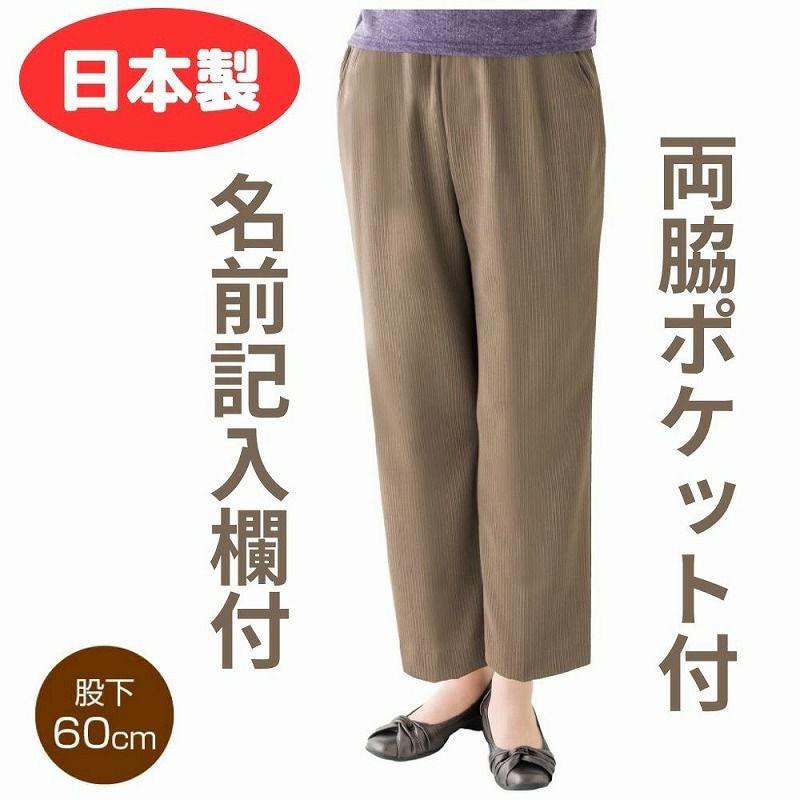 快適な日常生活をお過ごしいただけるためにお役立ていただける商品です着やすさとやさしい工夫のアイテムです一年を通してはけるフリーパンツ細い縦畝が入った、おしゃれな見た目。名前記入欄付で間違い防止名前が書けるタグ付きなので、入院や施設入居時など、脱いだ後や洗濯後も他人のものと間違うことがありません。●品名/婦人親子ピケフリーパンツ●色/モカ・グレー・ブラック●サイズ/M・L・LL・3L●素材/ポリエステル95%・ポリウレタン5%●生産国/日本製●仕様/※ウエストゴム取替え仕様ではありません。 洗濯機OK(ネット使用) 名前記入欄付 両脇ポケット付 股下60cm のびのび(縦・横)●説明/一年を通してはけるフリーパンツ細い縦畝が入った、おしゃれな見た目。