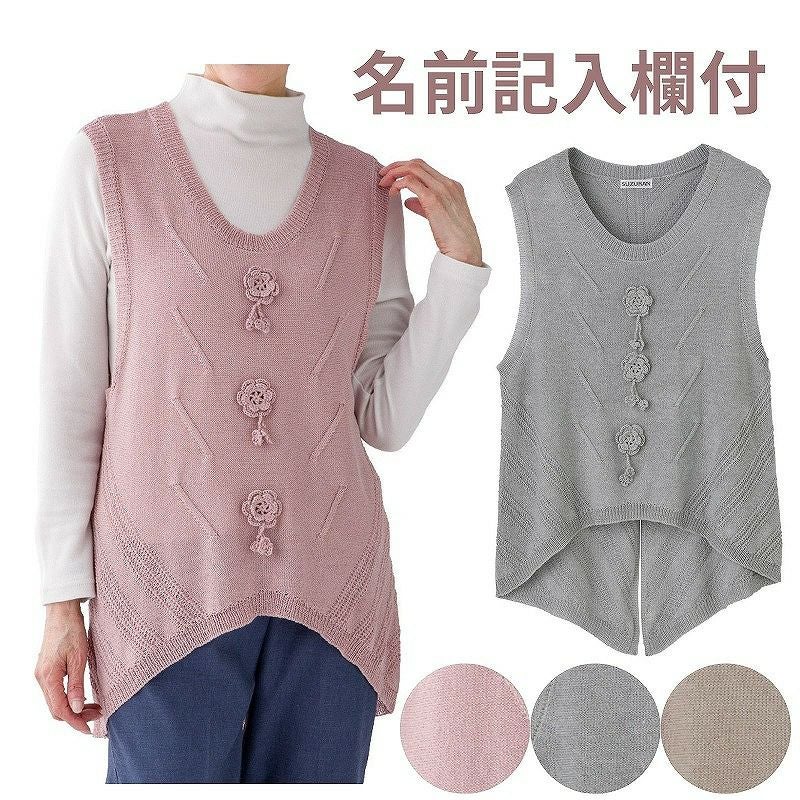 快適な日常生活をお過ごしいただけるためにお役立ていただける商品です着やすさとやさしい工夫のアイテムです着やすさと着心地ゆったり感がうれしいお洒落なニットでのんびりリラックスタイムお花のモチーフがかわいい、フェミニン調のチュニック丈。ゆったりした身幅で、脱ぎ着もしやすく、快適な着心地です。名前記入欄付で間違い防止名前が書けるタグ付きなので、入院や施設入居時など、脱いだ後や洗濯後も他人のものと間違うことがありません。後ろ身頃を長めにしているので、背中が曲がった方でも、背中が出にくい設計です。●品名/ニット花モチーフベスト●色/ベージュ・ローズ・グレー●サイズ/M~L●素材/レーヨン90%・ナイロン10%●生産国/中国製●仕様/洗濯機OK 名前記入欄付 身幅ゆったり 後ろ身頃長め 花モチーフ ●説明/着やすさと着心地ゆったり感がうれしいお洒落なニットでのんびりリラックスタイムお花のモチーフがかわいい、フェミニン調のチュニック丈。