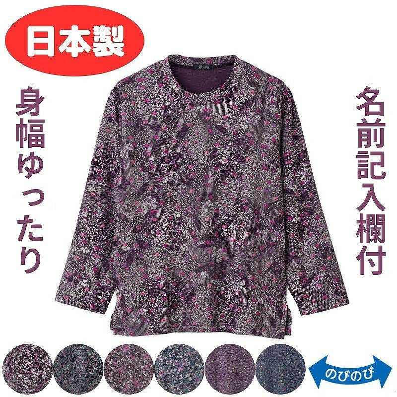 快適な日常生活をお過ごしいただけるためにお役立ていただける商品です着やすさとやさしい工夫のアイテムですチリメン素材のTシャツは季節を問わず大活躍のアイテムです品があり華やかな京染めちりめんが素敵です!上質で安心感のある日本製。ゆったりした身幅で、脱ぎ着もしやすく、快適な着心地です。名前記入欄付で間違い防止名前が書けるタグ付きなので、入院や施設入居時など、脱いだ後や洗濯後も他人のものと間違うことがありません。●品名/京染めチリメンプリントTシャツ●色/小花アズキ・小花パープル・大花パープル・大花ブラック・中花パープル・中花ブルー●サイズ/M~L●素材/ポリエステル95%・ポリウレタン5%●生産国/日本製●仕様/洗濯機OK 名前記入欄付 身幅ゆったり のびのび●説明/チリメン素材のTシャツは季節を問わず大活躍のアイテムです品があり華やかな京染めちりめんが素敵です!上質で安心感のある日本製。