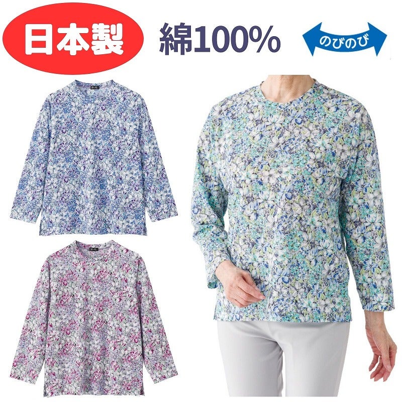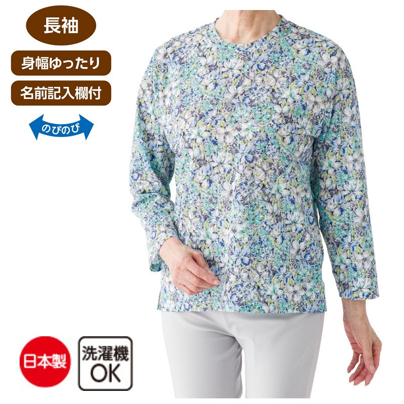 快適な日常生活をお過ごしいただけるためにお役立ていただける商品です着やすさとやさしい工夫のアイテムですさらりとした肌ざわりの綿100%素材で快適に着られるTシャツ。上品な京染めの風合いが装いをやさしく引き立てます。身幅ゆったりで動きやすく、名前記入欄付きで便利♪安心の日本製で、毎日の普段着に活躍する一枚です。ゆったりした身幅で、脱ぎ着もしやすく、快適な着心地です。名前記入欄付で間違い防止名前が書けるタグ付きなので、入院や施設入居時など、脱いだ後や洗濯後も他人のものと間違うことがありません。●品名/京染め綿100%Tシャツ●色/ローズ・ブルー・パープル●サイズ/M~L●素材/綿100%●生産国/日本製●仕様/洗濯機OK(ネット使用) 日本製 名前記入欄付 身幅ゆったり のびのび 長袖 さらりとした綿100%素材を使用。安心の日本製です。