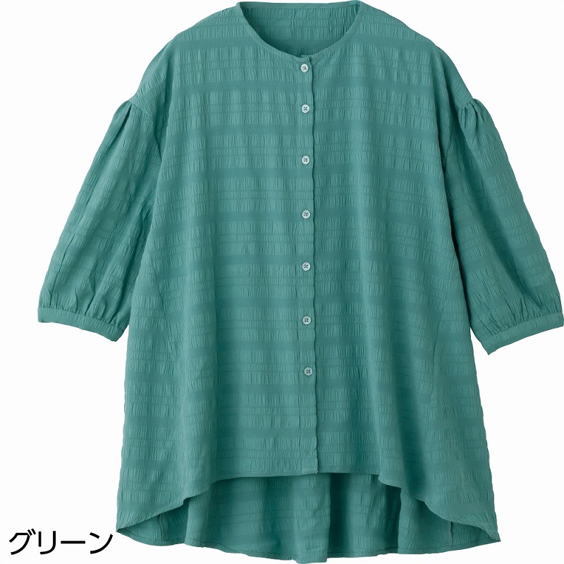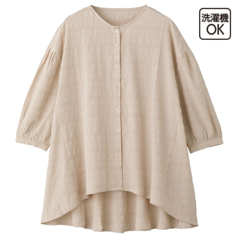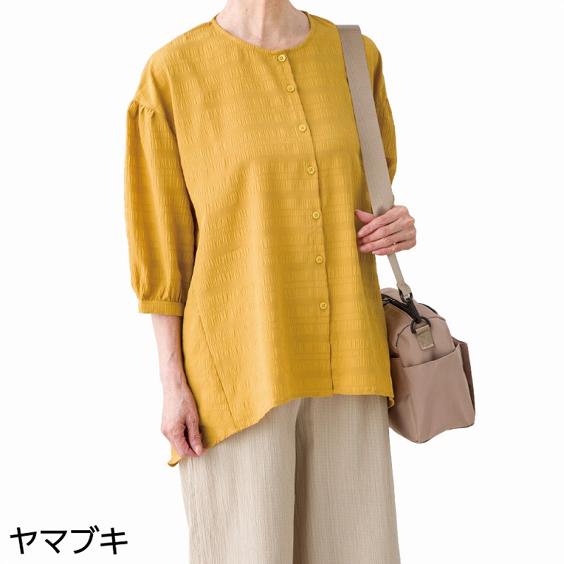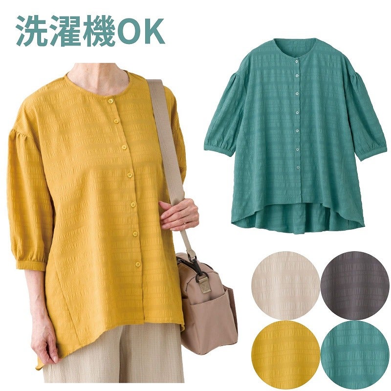 快適な日常生活をお過ごしいただけるためにお役立ていただける商品です着やすさとやさしい工夫のアイテムですさらりとした肌ざわりのサッカー生地で、軽やかに着られる一枚です♪ 凹凸のある素材で肌に張りつきにくく、心地よい着心地。後ろ長めの丈が背中からおしりまでやさしくカバーし、安心感のあるシルエットに仕上げました。●品名/7分袖やわらかサッカーブラウス●色/ベージュ・ヤマブキ・グリーン・グレー●サイズ/M~L●素材/ポリエステル98%・ポリウレタン2%●生産国/インド製●仕様/洗濯機OK(ネット使用)さらりとした肌ざわりのサッカー生地。後ろ長め丈で背中とおしりをカバー。