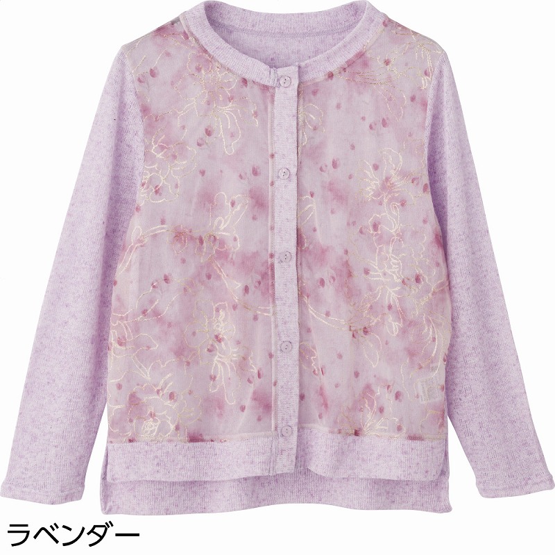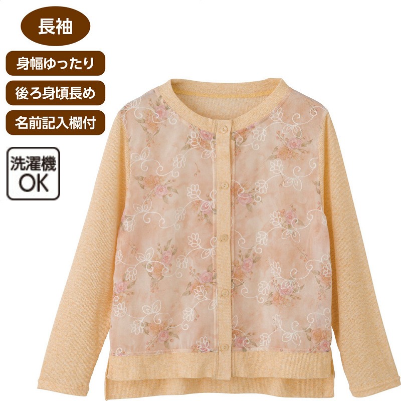 快適な日常生活をお過ごしいただけるためにお役立ていただける商品です着やすさとやさしい工夫のアイテムです軽やかでほんのり透け感のある春らしい素材に、やさしい花柄オーガンジーが華やかな印象♪身幅ゆったりでラクな着心地、後ろ身頃が少し長めなので背中まわりも安心です。内側には名前記入欄つきで施設やお出かけにも便利。季節をまたいで長く愛用できる一枚です。後ろ身頃を長めにしているので、背中が曲がった方でも、背中が出にくい設計です。ゆったりした身幅で、脱ぎ着もしやすく、快適な着心地です。名前記入欄付で間違い防止名前が書けるタグ付きなので、入院や施設入居時など、脱いだ後や洗濯後も他人のものと間違うことがありません。●品名/オーガンジー花柄切替カーディ●色/ラベンダー・オレンジ・イエロー・パープル●サイズ/M~L●素材/無地部分:ポリエステル85%・麻15%、プリント部分:ポリエステル65%・レーヨン35%●生産国/中国製●仕様/洗濯機OK(ネット使用) 名前記入欄付 柄の出方が異なる場合があります。 後ろ身頃長め 身幅ゆったり 長袖 軽くて透け感のある春らしい素材。長く活躍します。