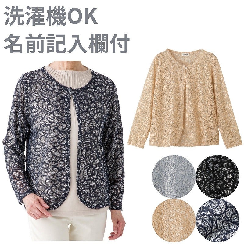 シンプルなTシャツにさっと重ねるだけで華やかな印象になるレーストッパーカーディガン。軽やかな着心地で冷房対策や季節の変わり目にも活躍します。身幅ゆったりで動きやすく、名前記入欄付きで安心して使えます♪上品な透け感がおしゃれな一枚です。