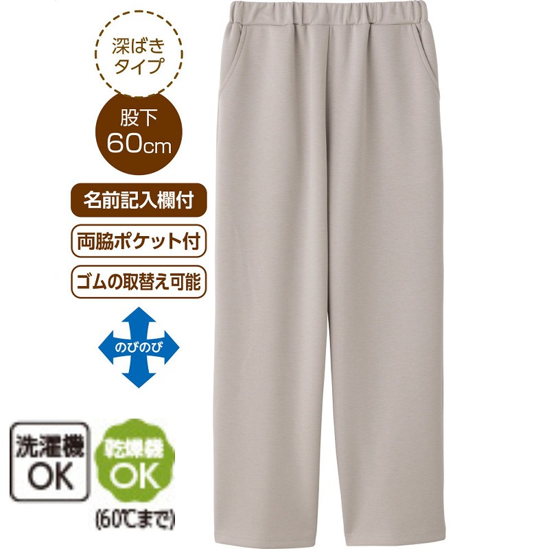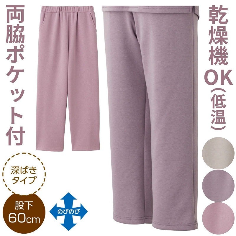 快適な日常生活をお過ごしいただけるためにお役立ていただける商品です着やすさとやさしい工夫のアイテムですなめらかで快適なストレッチ素材を使用したストレートパンツ。一年中使いやすく、たてよこ伸縮で動きやすいのが魅力です。深ばきタイプで安心、両脇ポケット付き&ゴムの取り換え可能で便利。名前記入欄付き、乾燥機OK(60℃まで)で毎日活躍します♪名前記入欄付で間違い防止名前が書けるタグ付きなので、入院や施設入居時など、脱いだ後や洗濯後も他人のものと間違うことがありません。乾燥機が使えるからお手入れ簡単!【乾燥機対応アウター】お手入れラクラクでうれしい!お洗濯の手間が減ります。乾燥機は低温でご使用ください。●品名/リラクシングストレートパンツ●色/ラベンダー・ローズ・グレージュ●サイズ/S・M・L・LL・3L●素材/ポリエステル78%・レーヨン16%・ポリウレタン6%●生産国/中国製●仕様/洗濯機OK(ネット使用) 名前記入欄付 両脇ポケット付 のびのび(縦・横) ゴム取替え可能 乾燥機OK(60℃まで) 深ばきタイプ 股下60cm なめらかで気持ち良い肌ざわり。一年中使えるストレッチ素材。