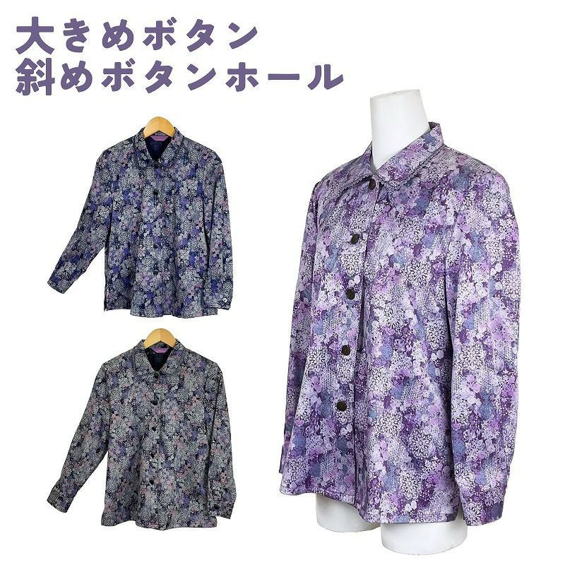 快適な日常生活をお過ごしいただけるためにお役立ていただける商品です着やすさとやさしい工夫のアイテムです【デイリーカジュアルスタイル】お出かけにも普段着にも着られるから多方面で大活躍のアイテムゆったりとしたシルエット。着やすさと着心地ゆったり感がうれしいお洒落なブラウスです。落ち着いた色柄の京都染プリントブラウス(生地・付属品は日本品質)目を惹く斬新な花柄。着脱カンタン!様々な工夫力が入りやすくつかみやすい大きめボタンと斜めボタンホールで留め外しがスムースで脱ぎ着しやすい工夫を凝らした優しい設計です。ゆったりした身幅で、脱ぎ着もしやすく、快適な着心地です。●品名/婦人長袖大きめボタンプリントブラウス●色/パープル・ネイビー・ブラック●サイズ/M・L●素材/ポリエステル100%レース:レーヨン90% 綿10%●生産国/中国製(日本製の生地と付属を中国で縫製)●仕様/大きめボタン&斜めボタンホール 身幅ゆったり●説明/落ち着いた色柄の京都染プリントブラウス(生地・付属品は日本品質)上品でエレガントな花柄です。