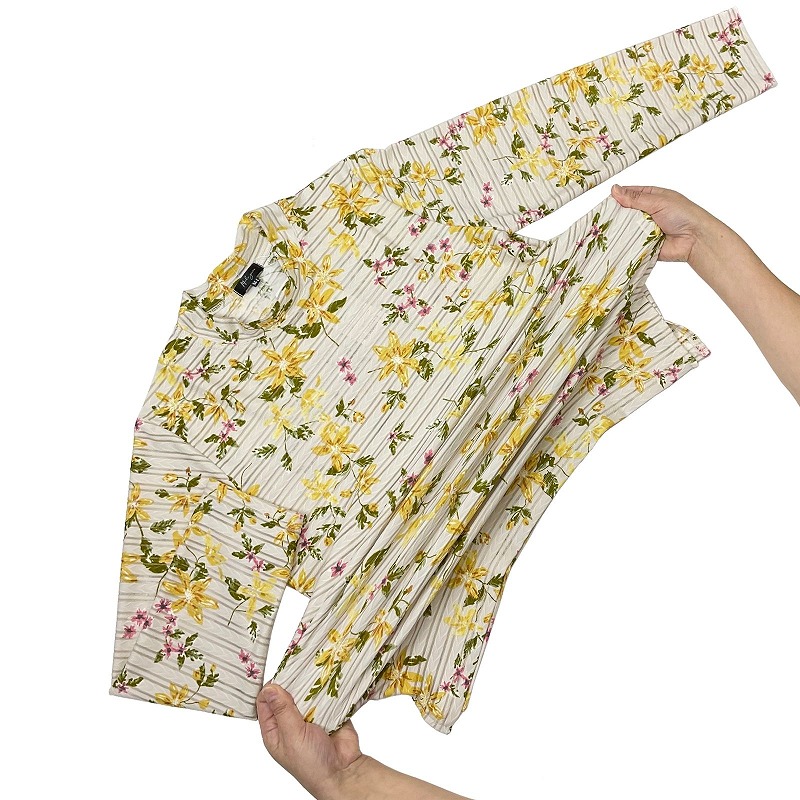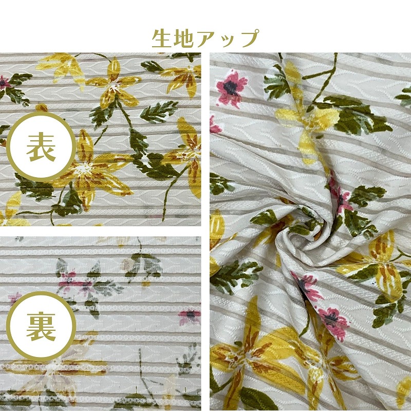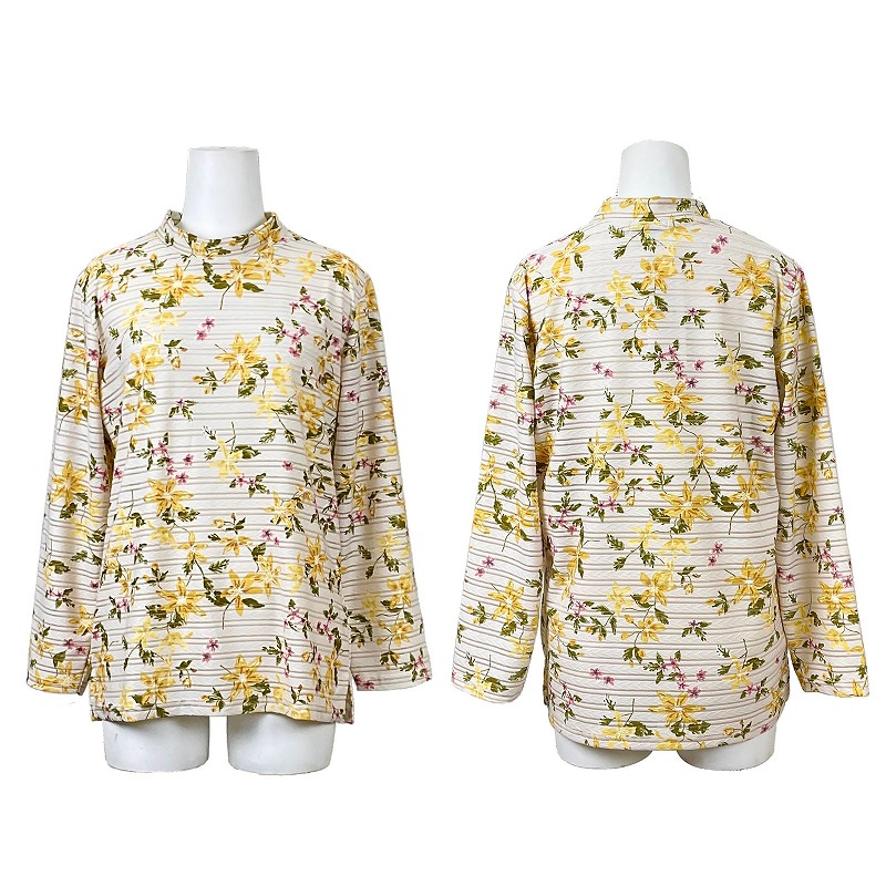 快適な日常生活をお過ごしいただけるためにお役立ていただける商品です肌あたりの良い素材で快適な着心地です。●品名/婦人ジャガードプリントTシャツ●色/ネイビー・パープル・ベージュ●サイズ/M-L●素材/ポリエステル90%・ポリウレタン10%●生産国/中国製●仕様/長袖●説明/ジャガード生地に花柄プリントを重ねた上品で華やかな長袖Tシャツです。ボーダー部分は透け感のある素材になっており、軽やかでやわらかな印象に。一枚で着ても重ね着しても使いやすく、普段使いからお出かけまで幅広く活躍します。