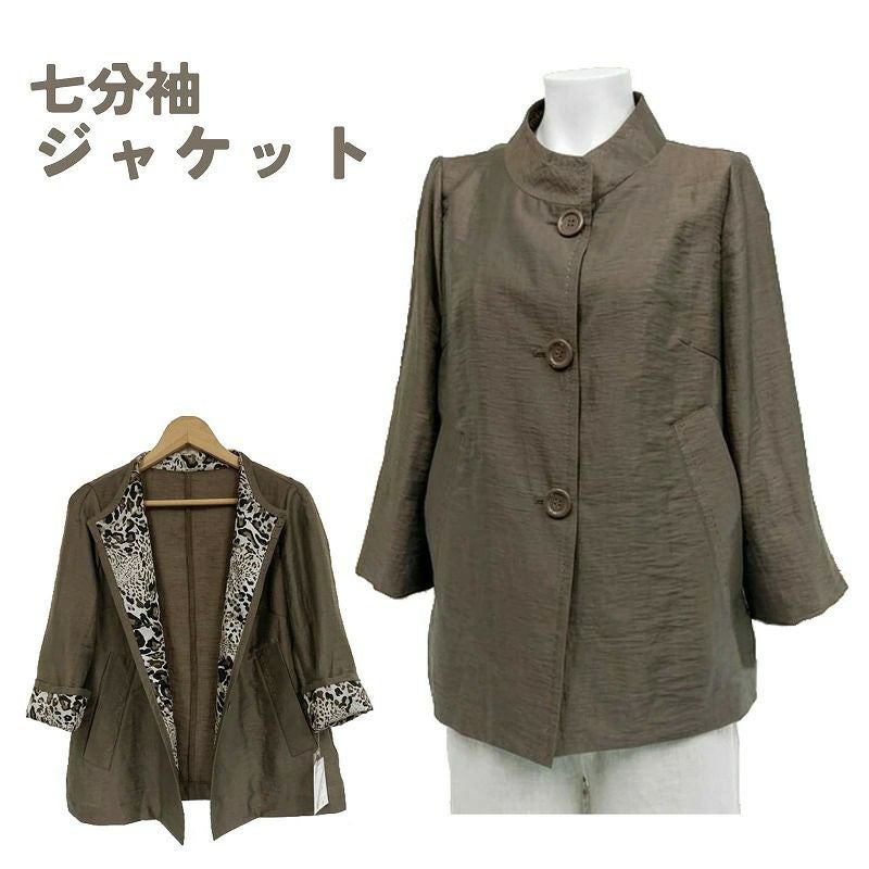 おしゃれを楽しんでいただけるアイテムです七分袖リネンジャケットです。スタンドカラーから前立てにかけてとポケット部分に手縫いステッチ入りです。身返し、カフス裏にアニマルプリント生地を使用。裏地なしの一重ジャケットです。●サイズ/M(商品札記載)バスト83身長158(商品平置実寸)バスト98肩幅36袖丈46後身丈59アームホール49●材質/本体・麻63%ナイロン37% 布帛別布・ポリエステル100%●生産国/中国製