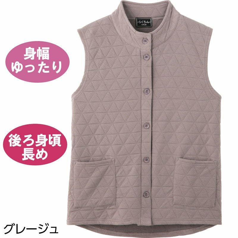 快適な日常生活をお過ごしいただけるためにお役立ていただける商品です着やすさとやさしい工夫のアイテムですあなたにやさしいお洋服【らくちんdeシリーズ】脱ぎ着しやすい工夫がいっぱい!キルト加工で見た目もあったか。着脱カンタン!様々な工夫力が入りやすくつかみやすい大きめボタンと斜めボタンホールで留め外しがスムースで脱ぎ着しやすい工夫を凝らした優しい設計です。ゆったりした身幅で、脱ぎ着もしやすく、快適な着心地です。後ろ身頃を長めにしているので、背中が曲がった方でも、背中が出にくい設計です。名前記入欄付で間違い防止名前が書けるタグ付きなので、入院や施設入居時など、脱いだ後や洗濯後も他人のものと間違うことがありません。●品名/婦人斜め釦ホールキルトベスト●色/グレージュ・スモークブルー●サイズ/M・L●素材/ポリエステル98%・ポリウレタン2%●生産国/中国製●仕様/手洗い 名前記入欄付 大きめボタン&斜めボタンホール 前ポケット付 後ろ身頃長め 身幅ゆったり のびのび●説明/あなたにやさしいお洋服【らくちんdeシリーズ】脱ぎ着しやすい工夫がいっぱい!キルト加工で見た目もあったか。