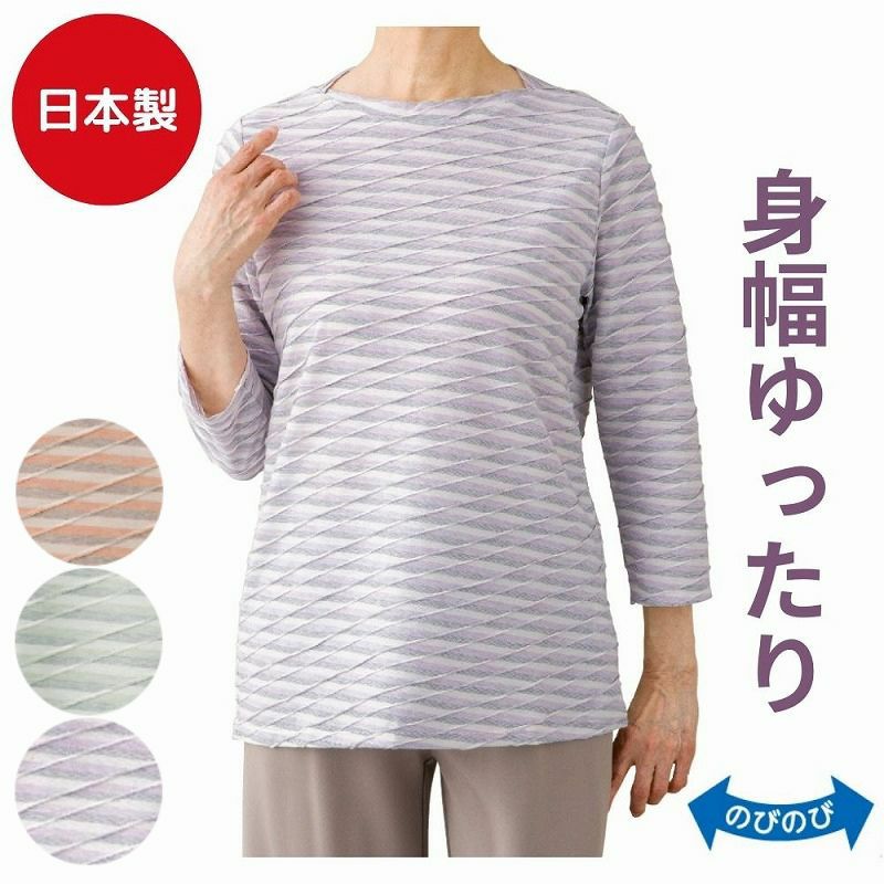 快適な日常生活をお過ごしいただけるためにお役立ていただける商品です着やすさとやさしい工夫のアイテムです【デイリーカジュアルスタイル】軽快な大人の遊び心を弾ませてデイリーの着こなしを!着心地の良いきれな色目のさわやかインナーです表面変化が上品なボーダー柄。ゆったりした身幅で、脱ぎ着もしやすく、快適な着心地です。●品名/婦人7分袖タックジャカードTシャツ●色/ラベンダー・グリーン・オレンジ●サイズ/M・L・LL●素材/綿55%・ポリエステル45%●生産国/日本製●仕様/洗濯機OK 名前記入欄付 身幅ゆったり のびのび 7分袖●説明/【デイリーカジュアルスタイル】軽快な大人の遊び心を弾ませてデイリーの着こなしを!着心地の良いきれな色目のさわやかインナーです表面変化が上品なボーダー柄。