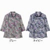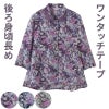 マジックテープ商品に関するご注意洗濯時にはゴミのなどの付着の原因になりますのでテープを張り合わせてください。ゆったりした身幅で、脱ぎ着もしやすく、快適な着心地です。名前記入欄付で間違い防止名前が書けるタグ付きなので、入院や施設入居時など、脱いだ後や洗濯後も他人のものと間違うことがありません。後ろ身頃を長めにしているので、背中が曲がった方でも、背中が出にくい設計です。●品名/7分袖ワンタッチテープブラウス●色/グレー・パープル・ネイビー●サイズ/M・L●素材/ポリエステル100%●生産国/中国製●仕様/手洗い 名前記入欄付 ワンタッチテープ 後ろ身頃長め 身幅ゆったり 7分袖 ●説明/【デイリーカジュアルスタイル】お出かけにも普段着にも着られるから多方面で大活躍のアイテム。ゆったりとしたシルエット。着やすさと着心地ゆったり感がうれしいお洒落なブラウスです。落ち着いた色柄の京都染プリントブラウス(生地・付属品は日本品質)牡丹や薔薇を思わせる、少し大きめの花柄がエレガント。