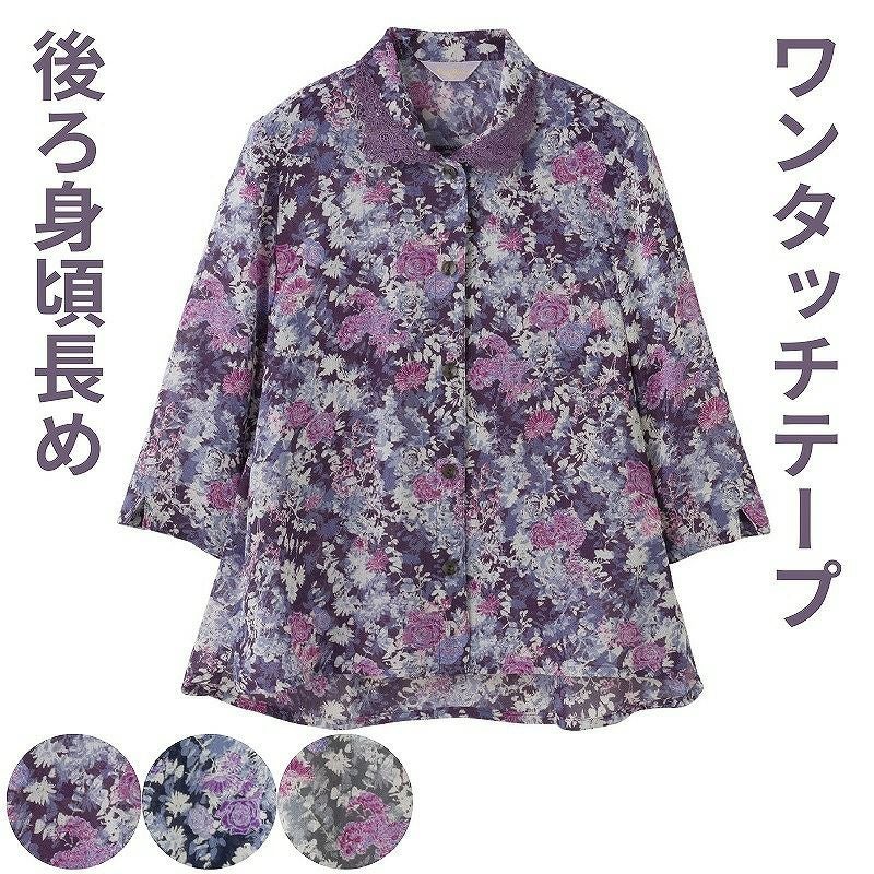 快適な日常生活をお過ごしいただけるためにお役立ていただける商品です着やすさとやさしい工夫のアイテムです【デイリーカジュアルスタイル】お出かけにも普段着にも着られるから多方面で大活躍のアイテム。ゆったりとしたシルエット。着やすさと着心地ゆったり感がうれしいお洒落なブラウスです。落ち着いた色柄の京都染プリントブラウス(生地・付属品は日本品質)牡丹や薔薇を思わせる、少し大きめの花柄がエレガント。着脱カンタン!様々な工夫ワンタッチテープ仕様でボタンが留めにくい方も脱ぎ着しやすい工夫を凝らした優しい設計です。手や指の負担も軽減します。着替えや検温時にはさっと開閉できます。飾りボタンで見た目は普通の洋服と変わりませんマジックテープ商品に関するご注意洗濯時にはゴミのなどの付着の原因になりますのでテープを張り合わせてください。ゆったりした身幅で、脱ぎ着もしやすく、快適な着心地です。名前記入欄付で間違い防止名前が書けるタグ付きなので、入院や施設入居時など、脱いだ後や洗濯後も他人のものと間違うことがありません。後ろ身頃を長めにしているので、背中が曲がった方でも、背中が出にくい設計です。●品名/7分袖ワンタッチテープブラウス●色/グレー・パープル・ネイビー●サイズ/M・L●素材/ポリエステル100%●生産国/中国製●仕様/手洗い 名前記入欄付 ワンタッチテープ 後ろ身頃長め 身幅ゆったり 7分袖 ●説明/【デイリーカジュアルスタイル】お出かけにも普段着にも着られるから多方面で大活躍のアイテム。ゆったりとしたシルエット。着やすさと着心地ゆったり感がうれしいお洒落なブラウスです。落ち着いた色柄の京都染プリントブラウス(生地・付属品は日本品質)牡丹や薔薇を思わせる、少し大きめの花柄がエレガント。