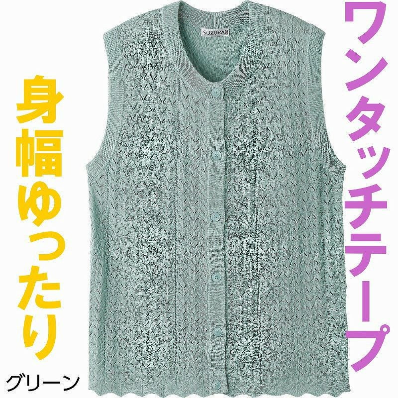 快適な日常生活をお過ごしいただけるためにお役立ていただける商品です着やすさとやさしい工夫のアイテムです【快適ニット】機能性とお洒落を追求しました着やすさとやさしい工夫がうれしい!冷房や日除け対策にも欠かせない快適ニットインナーとも合わせやすく、脱ぎ着しやすく羽織るのに便利!見た目は普通のボタンですが、留め外しが簡単なワンタッチテープです。透け感あって夏にぴったりな快適ニット。●品名/ニットワンタッチ丸首ベスト●色/ベージュ・ラベンダー・ローズ・グリーン●サイズ/M-L●素材/レーヨン90%・ナイロン10%●生産国/中国製●仕様/洗濯機OK 名前記入欄付 ワンタッチテープ 身幅ゆったり●説明/【快適ニット】機能性とお洒落を追求しました着やすさとやさしい工夫がうれしい!冷房や日除け対策にも欠かせない快適ニットインナーとも合わせやすく、脱ぎ着しやすく羽織るのに便利!見た目は普通のボタンですが、留め外しが簡単なワンタッチテープです。透け感あって夏にぴったりな快適ニット。