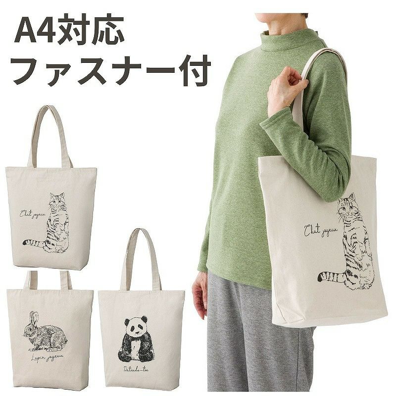 快適な日常生活をお過ごしいただけるためにお役立ていただける商品ですやさしい工夫のアイテムですアニマルプリントが可愛らしい!ファスナー付きが嬉しいポイント!使いやすくてお洒落なバッグで、日常使いにピッタリです●品名/ファスナー付きアニマルトートバッグ●色/ねこ・うさぎ・ぱんだ●サイズ/フリー●素材/綿70%・ポリエステル30%、裏地:綿70%・レーヨン30%●生産国/バングラディシュ製●仕様/不可 背面ファスナーポケット付 縦40×横37.5(開閉部)・27(底)×マチ10.5cm A4サイズ入ります 開閉部ファスナー付 外側ポケット×1、内側ポケット×1 ●説明/アニマルプリントが可愛らしい!ファスナー付きが嬉しいポイント!使いやすくてお洒落なバッグで、日常使いにピッタリです