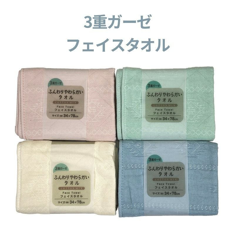 快適な日常生活をお過ごしいただけるためにお役立ていただける商品ですやさしく包み込んでくれるようなやわらかさが魅力の3重ガーゼタオルです。●品名/ふんわりやわらかい3重ガーゼフェイスタオル●色/ピンク・グリーン・アイボリー・ブルー●サイズ/約34×78㎝●素材/綿100%●生産国/中国製●仕様/ガーゼタオル●説明/肌ざわりの良い綿素材を3重に重ねた、ふんわり軽やかなガーゼタオル。使うたびに肌になじみ、やさしく包み込んでくれるようなやわらかさが魅力です。お肌の敏感な方や、ご高齢の方にもやさしい使い心地です。厚すぎず、薄すぎないちょうどいいボリューム感で毎日の暮らしにぴったりです。ご自宅用はもちろん、贈り物にもおすすめです。ふんわりやわらかい3重ガーゼバスタオルも販売中です【ふんわりやわらかい3重ガーゼバスタオル 約60×120㎝】はこちら