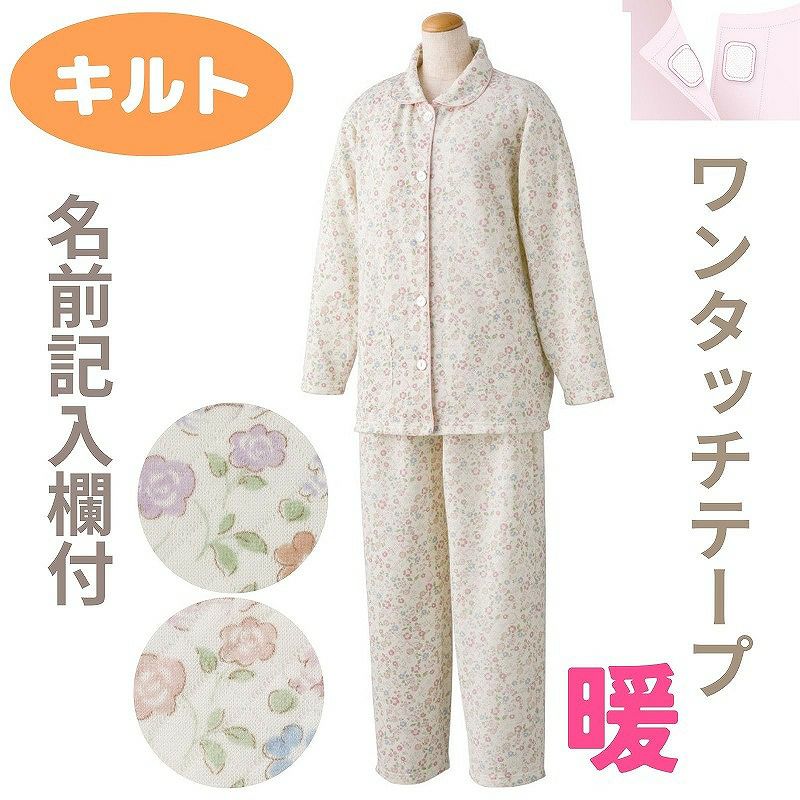 快適な日常生活をお過ごしいただけるためにお役立ていただける商品です着やすさとやさしい工夫のアイテムです暖かい空気を逃しにくい秋冬に最適な保温性のよいキルト素材。キルト素材は温かくなった空気を逃さず保温性抜群!ふんわり暖かなキルトパジャマです。着脱カンタン!様々な工夫【ワンタッチテープ】ボタンが留めにくい方は前合わせのワンタッチテープ仕様で、着替えがスムーズにワンタッチ肌着で前が開くので着脱が楽です開け閉めがさっとできるから着替えがラクラク!着やすく脱ぎやすい親切設計!前開きなので一人でも簡単につけることができますマジックテープ商品に関するご注意洗濯時にはゴミのなどの付着の原因になりますのでテープを張り合わせてください。名前記入欄付で間違い防止名前が書けるタグ付きなので、入院や施設入居時など、脱いだ後や洗濯後も他人のものと間違うことがありません。●品名/婦人ワンタッチキルトパジャマ●色/ピンク・パープル●サイズ/M・L●素材/ポリエステル85%・綿15%●生産国/中国製●仕様/洗濯機OK(ネット使用) 名前記入欄付 ワンタッチテープ キルト ※柄は若干変更になる場合もございます。●説明/暖かい空気を逃しにくい秋冬に最適な保温性のよいキルト素材。キルト素材は温かくなった空気を逃さず保温性抜群!ふんわり暖かなキルトパジャマです。