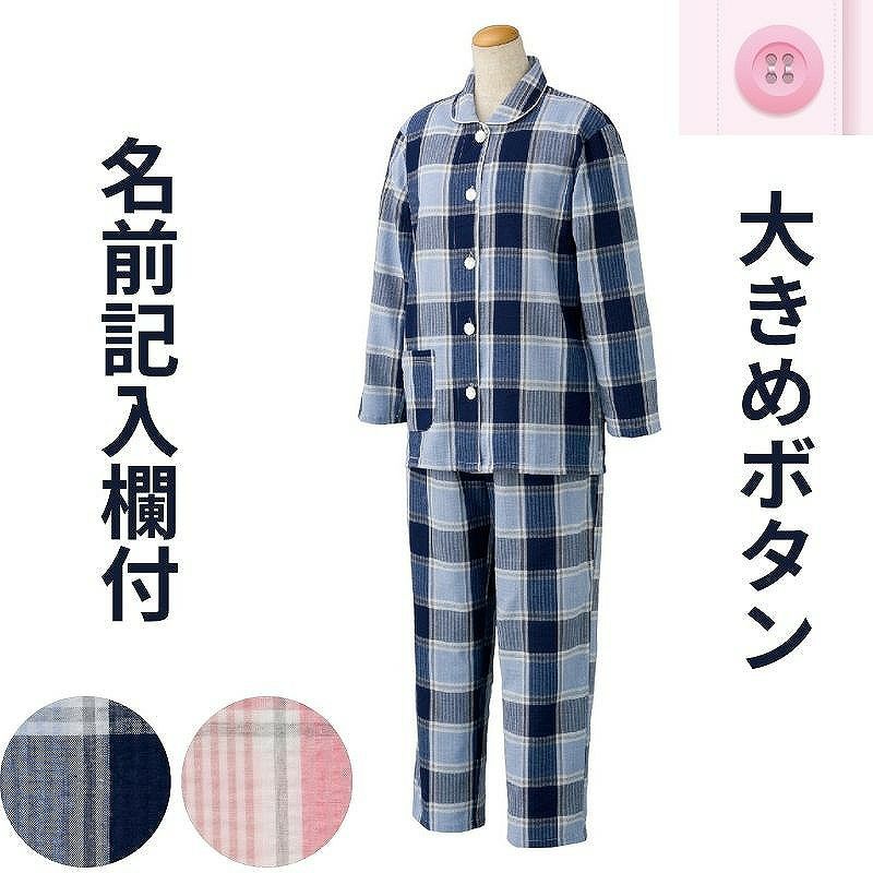 快適な日常生活をお過ごしいただけるためにお役立ていただける商品です着やすさとやさしい工夫のアイテムです【大きめボタン】つかみやすい大きめのボタンで留め外しがラクにできます。おしゃれなデザインのパジャマです。凹凸があり肌に密着しにくい。爽やかな肌触りで涼しい肌離れの良いサッカー素材です。着脱カンタン!様々な工夫脱ぎ着しやすい工夫を凝らした優しい設計です。つかみやすい大きめボタンで手の力が弱くてもボタンの留め外しがラクラクです。一般のボタンに比べてつかみやすい大きめボタンを採用。この違いがご自身での着脱も簡単にしてくれます。名前記入欄付で間違い防止名前が書けるタグ付きなので、入院や施設入居時など、脱いだ後や洗濯後も他人のものと間違うことがありません。●品名/婦人大きめボタンサッカーパジャマ 春夏用●色/ピンク・ブルー●サイズ/M・L●素材/ポリエステル65%・綿35%●生産国/中国製●仕様/洗濯機OK 名前記入欄付 大きめボタン ※柄は若干変更になる場合もございます。●説明/【大きめボタン】つかみやすい大きめのボタンで留め外しがラクにできます。おしゃれなデザインのパジャマです。凹凸があり肌に密着しにくい。爽やかな肌触りで涼しい肌離れの良いサッカー素材です。