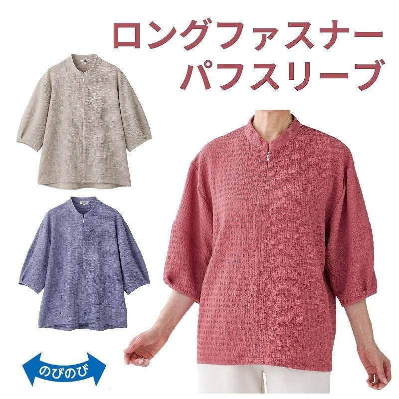 快適な日常生活をお過ごしいただけるためにお役立ていただける商品です着やすさとやさしい工夫のアイテムですファスナー合わせが不要。下からでも着脱できます。上からでも下からでも脱ぎ着できるロングファスナーで着替えがラクラクです。肩が上がりにくい方もスムーズに脱ぎ着できます。ボリューム感のあるパフスリーブが華やか!二の腕カバーにもぴったりです。凹凸感のある、やわらかな素材を使用しています。着脱カンタン!様々な工夫ファスナー合わせが不要。下からでも着脱できます。上からでも下からでも脱ぎ着できるロングファスナーで着替えがラクラクです。上からすっぽりかぶれて、脱ぎ着ラクラク!ロングファスナーTシャツゆったりした身幅で、脱ぎ着もしやすく、快適な着心地です。名前記入欄付で間違い防止名前が書けるタグ付きなので、入院や施設入居時など、脱いだ後や洗濯後も他人のものと間違うことがありません。後ろ身頃を長めにしているので、背中が曲がった方でも、背中が出にくい設計です。●品名/ロングファスナーパフスリーブTシャツ●色/グレージュ・ローズ・パープル●サイズ/M~L・LL●素材/ポリエステル95%・ポリウレタン5%●生産国/中国製●仕様/洗濯機OK(ネット使用) 名前記入欄付 ロングファスナー 後ろ身頃長め 身幅ゆったり のびのび 6分袖 ●説明/ファスナー合わせが不要。下からでも着脱できます。上からでも下からでも脱ぎ着できるロングファスナーで着替えがラクラクです。肩が上がりにくい方もスムーズに脱ぎ着できます。ボリューム感のあるパフスリーブが華やか!二の腕カバーにもぴったりです。凹凸感のある、やわらかな素材を使用しています。