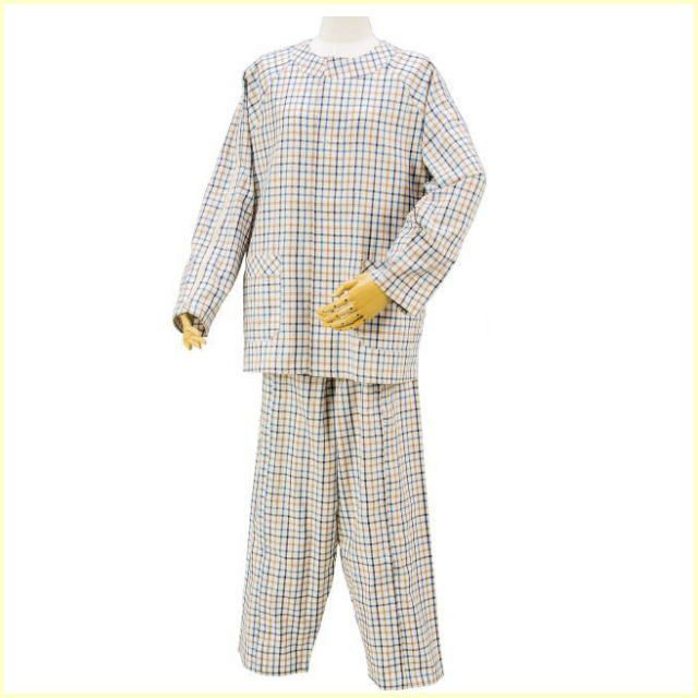 快適な日常生活をお過ごしいただけるために お役立ていただける商品です 肩開きパジャマセット (男女兼用) ・寝たままでも着替えが簡単。脱がずに点滴ができます。 ・肩から袖口までのファスナーがあり、開くと1枚の布になります。 男女兼用です。 ●素材/綿100% ●生産国/日本 ●手洗い可 ●洗濯機可 ●脱水機可